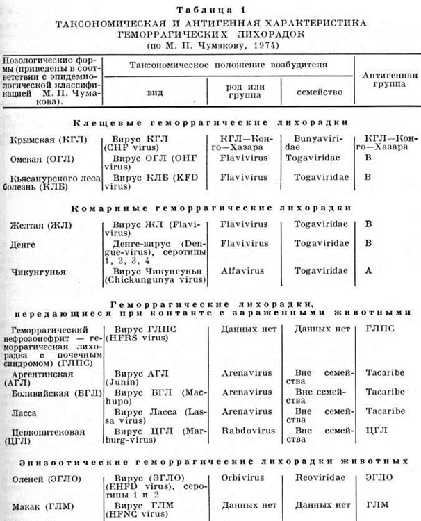 Возбудители Геморрагические лихорадки весьма разнообразны и, по неполным данным, входят не менее чем в 5 родов и 3 семейства вирусов. К семейству Тогавирусов относятся вирусы двух родов: флавивирусы — возбудители омской Геморрагические лихорадки, Кьясанурского леса болезни, жёлтой лихорадки, лихорадки денге и альфавирус — чикунгунья. К семейству Буньявирусов относится вирус крымской геморрагической лихорадки. Возбудители трёх форм Геморрагические лихорадки: аргентинской, боливийской и лихорадки Ласса (африканской) входят в состав рода ареновирусы (смотри). Вирус Марбург-церкопитековой Геморрагические лихорадки отнесён к рабдовирусам (смотри). Вирус эпизоотической Геморрагические лихорадки оленей входит в род Orbivirus и семейство Reoviridae. Таксономическое положение вирусов геморрагического нефрозонефрита и Геморрагические лихорадки макак ещё не определено.