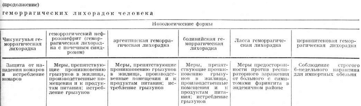 Вышеуказанные Геморрагические лихорадки бесспорно этиологически связаны с арбовирусами, то есть возбудителями, передаваемыми человеку через укусы кровососущих членистоногих паразитов — клещей или комаров (смотри Арбовирусы). Существует, однако, ещё 5 самостоятельных форм Геморрагические лихорадки, которые не передаются человеку через укусы членистоногих, а заражение происходит при контакте людей с животными — источниками инфекции. К ним относятся геморрагический нефрозонефрит (смотри), аргентинская и боливийская геморрагические лихорадки (смотри Южноамериканские геморрагические лихорадки), Ласса геморрагическая лихорадка (смотри Ласса лихорадка) и церкопитековая геморрагическая лихорадка (Марбургвирусная болезнь), связанная с заражением от мартышек (смотри Церкопитековая геморрагическая лихорадка). Эти Геморрагические лихорадки не принадлежат к арбовирусным болезням человека, хотя считается, что при некоторых из них отдельные виды кровососущих членистоногих эктопаразитов имеют эпизоотологическое значение в поддержании очагов инфекции среди животных.