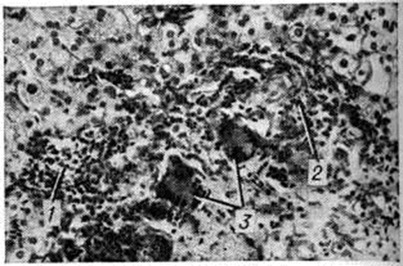 В ответ на первичное поражение гепатоцита любого генеза (вирусом, токсином, медикаментами и так далее) образуется антиген, индуцирующий сенсибилизацию лимфоцита, который вступает в реакцию с поражённым гепатоцитом непосредственно или с помощью антител, синтезируемых плазматическими клетками. Реакция антиген — антитело на тканевом уровне приводит к цитолизу интактных гепатоцитов. Этот процесс контролируется гомеостатическим механизмом, под влиянием которого антиген со временем исчезает и прекращается аутоаллергическая реакция лимфоцитов. В отдельных случаях наблюдается персистирование антигена, что поддерживает процесс массивного цитолиза гепатоцитов в результате цитотоксического эффекта реакции антиген — антитело (смотри Антиген — антитело реакция). Аутоиммунные процессы играют важную роль в патогенезе некротизирующего и особенно люпоидного Гепатит, определяя его самопрогрессирующее (независимое от этиологический фактора) течение. В механизме этого прогрессирования имеет значение нарушение микроциркуляции крови в печени вследствие развития базальной мембраны вдоль синусоидов и образования коллагеновых волокон между синусоидами и печёночными клетками. В патогенезе холестатических Гепатит основным является нарушение метаболизма желчных кислота и образования желчных мицелл в печёночной клетке, а также нарушение экскреции желчи в желчные капилляры и оттока её по холангиолам и другим внутрипечёночным желчным протокам. Патологическая анатомияПатоморфологические картина острых диффузных Гепатит, развивающихся при ряде инфекционных заболеваний (инфекционном мононуклеозе, адено- и энтеровирусной инфекции, иктеро-геморрагическом лептоспирозе, жёлтой лихорадке и другие), во многом сходна с патоморфологический. картиной вирусного гепатита, которому свойствен комплекс полиморфных изменений, охватывающих паренхиму и строму печени, а также внутрипечёночные желчевыводящие пути. Поэтому их дифференциальная диагностика по гистологический картине затруднена или даже невозможна [В. В. Золотаревский, 1969; Бьянки (С. Bianchi), 1967]. Иногда поражение паренхимы ограничивается только дистрофическими (зернистая и балонная дистрофии, парциальный некроз) изменениями гепатоцитов (дистрофический гепатит). В других случаях наблюдаются выраженные явления некробиоза, в результате которого некрозу подвергаются отдельные гепатоциты, паренхима центральной зоны или всей печёночной дольки (некротический гепатит). Патологический процесс может ограничиваться активацией мезенхимально-клеточных элементов и клеточной инфильтрацией портальных полей (межуточный гепатит). Так, при скарлатине, дифтерии, пневмонии наблюдается отёк портальных полей, активация и пролиферация эндотелиальных клеток с образованием клеточных инфильтратов. Дистрофические изменения в паренхиме выражены не резко. При сепсисе клеточная инфильтрация выражена резко, среди клеточных элементов отмечается много сегментоядерных лейкоцитов. Иногда клеточная инфильтрация носит очаговый характер, в ткани печени, вблизи портальных трактов, наблюдается формирование гранулём (брюшной и возвратный тиф); при сыпном тифе возможны типичные для этой инфекции васкулиты, что иногда приводит к очаговым некрозам паренхимы. При персистирующем Гепатит преобладаю