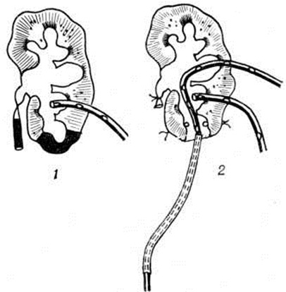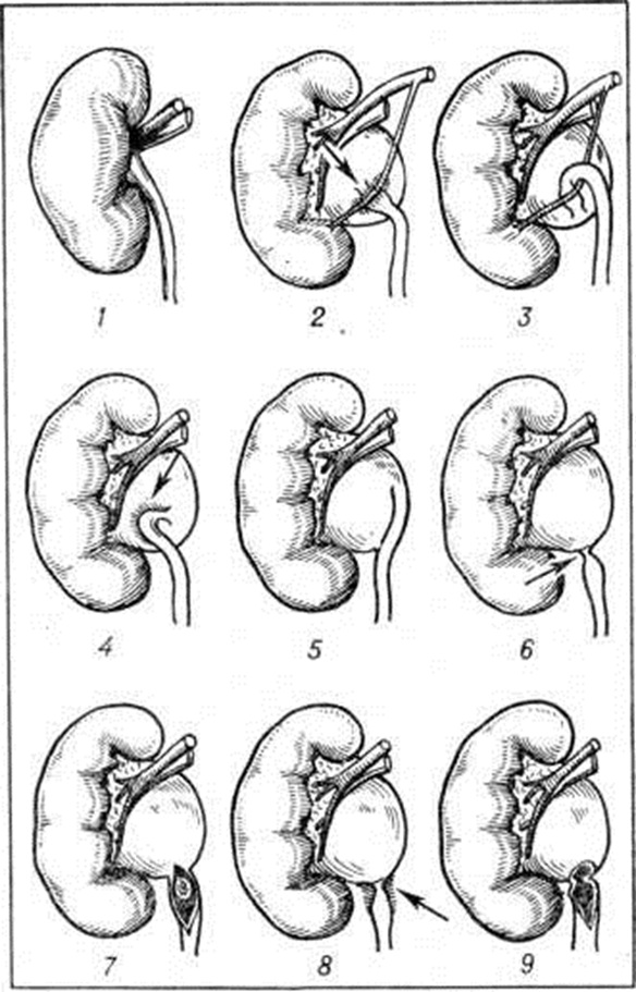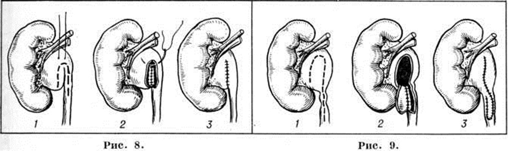 Показанием к пластическим операциям являются те стадии одно- и двустороннего Гидронефроз, при которых функция паренхимы в достаточной степени сохранена, а причина, вызвавшая болезнь, может быть устранена. Из множества способов оперативного лечения при Гидронефроз, возникших на почве изменений в области лоханочно-мочеточникового сегмента, чаще всего применяют операцию Фенгера, которая заключается в продольном рассечении стриктуры мочеточника или лоханочно-мочеточникового сегмента и сшивании в поперечном направлении (рисунок 6). Распространена и операция по Фолею — создание воронкообразного расширения прилоханочного отдела мочеточника (рисунок 7). Обязательным условием пластических операций является дренирование лоханки, сохраняемое в послеоперационном периоде от 12 до 30 дней; удаление дренажа допустимо лишь после восстановления свободного оттока мочи по мочеточнику. Условия «конечного» кровоснабжения почки ограничивают рассечение «добавочного сосуда». Высвобождение из спаек сосуда и лоханочно-мочеточникового сегмента, перемещение мочеточника антевазально с последующим пиелоанастомозом изменяют соотношения между сосудом и сегментом, в результате чего сосуд оказывается позади его. Наиболее широкое распространение по этим показаниям получили операции Альбаррана и Калпа — де Верда. Операция Альбаррана состоит в продольном рассечении мочеточника, начиная с неизменной части, с переходом через стриктуру на лоханку и наложении пиелоуретрального анастомоза (рисунок 8). Операция Калпа — де Верда заключается в выкраивании большого лоскута на ножке из лоханки, перемещении его на мочеточник, благодаря чему формируется новый сегмент мочеточника с большим просветом (рисунок 9). При внутрипочечной лоханке, создающей неблагоприятные условия для выполнения одной из перечисленных операций, целесообразно применить операцию уретерокаликоанастомоза (рисунок 10). Пластические операции иногда дополняют дупликацией почки, иногда с использованием различных тканей и синтетических материалов. К нефрэктомии (смотри) следует прибегать при таком одностороннем Гидронефроз, когда атрофия паренхимы выражена в резкой степени и функция почки глубоко изменена. Оставлять такую почку опасно из-за осложнений. Абсолютно противопоказана нефрэктомия в тех случаях, когда и вторая почка поражена каким-либо патологический процессом. Пиелостомия (смотри) и нефростомия (смотри) при Гидронефроз имеют ограниченные показания и применяются как самостоятельные операции в тех случаях, когда невозможно восстановить отток мочи в мочевой пузырь. Прогноз зависит от стадии процесса, его этиологии, состояния другой почки. В начальных стадиях одностороннего Гидронефроз, особенно если его причиной является «добавочный сосуд», оперативное вмешательство способствует выздоровлению и восстановлению нормальной функции почки. Отягощают прогноз пиелонефрит, двусторонние поражения, а также другие заболевания второй почки; но и в этих случаях комплексное лечение (противовоспалительная терапия и операция) позволяет длительно сохранять трудоспособность пациента. Гидронефроз у детей может быть не только врождённым заболеванием, но и приобретённым. Этиология — нарушение пассажа мочи из-за механического препятствия в области лоханочно-мочеточников