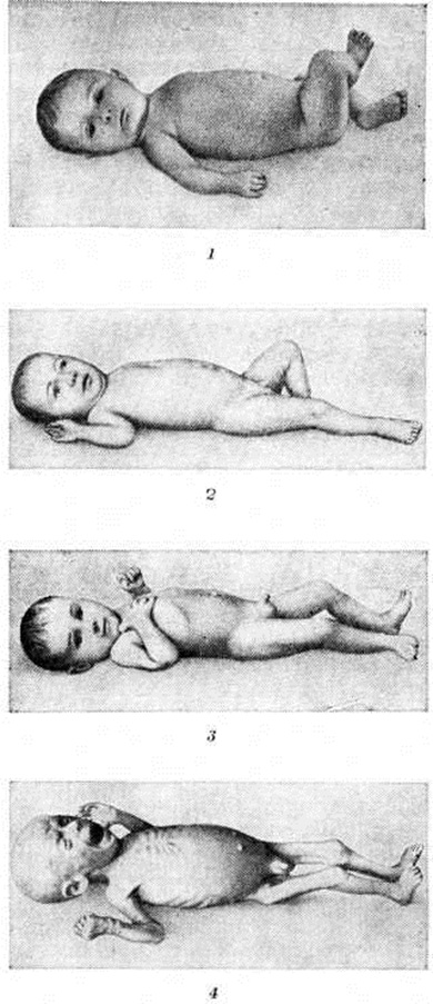 Гипотрофия у детей (для сравнения дана фотография здорового ребёнка — 1): 2— гипотрофия I степени — подкожный жировой слой на животе уменьшен; 3— гипотрофия II степени — подкожный жировой слой на животе почти полностью отсутствует, на других участках туловища и конечностях уменьшен; 4—гипотрофия III степени — подкожный жировой слой отсутствует, кожа морщинистая, собирается в складки, лицо имеет старческий вид, живот вздут, кожа на нем натянута.