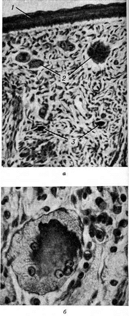 Макроскопически Гистиоцитома представляет собой возвышающийся над кожей плотный, безболезненный узел (диаметром до 1—2 сантиметров), на разрезе розовато-желтоватого цвета. Микроскопически под атрофичным эпидермисом определяется нечётко отграниченная от окружающей ткани опухоль, состоящая из множества клеток различной формы и размеров. Встречаются мелкие клетки с темными ядрами и очень скудной базофильной цитоплазмой, клетки типа эпителиоидных с пенистой цитоплазмой, содержащей жир (обычно двоякопреломляющий), и множество гигантских клеток Тутона (рисунок). Это очень крупные клетки с многочисленными ядрами, располагающимися в виде кольца или полукольца вокруг базофильного участка цитоплазмы в центре клетки. Периферический отдел цитоплазмы светлый, пенистого вида, содержит двоякопреломляющие липиды. Обнаруживаются также скопления типичных ксантомных клеток, значительное количество сосудов капиллярного типа и нежная рыхлая фиброзная ткань, кое-где с наличием ритмичных структур, близких к муаровым. Фиброзирование Гистиоцитома значительно реже, чем ангиофибромы (смотри полный свод знаний), опухоль содержит мало гемо-сидерофагов и этим несколько отличается от ангиофиброксантомы. Растёт медленно. Малигнизируется исключительно редко.