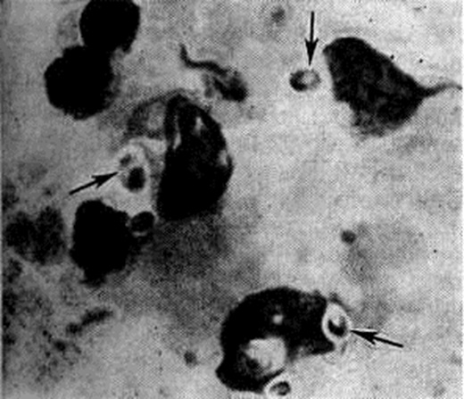 В легко протекающих случаях клинической, картина проявляется катаром верхних дыхательных путей с небольшим повышением температуры тела, кашлем, головной болью в течение недели. В более тяжёлых случаях — лихорадка ремиттирующего типа, озноб, пот, кашель с гнойной мокротой, иногда с кровью, головная боль, слабость, анорексия. В лёгких — инфильтраты одиночные и множественные по типу бронхопневмонии, лобулярной, лобарной пневмонии с регионарной лимфаденопатией. Физикальные данные минимальны; клинической, и рентгенологическое картина сходны с атипической пневмонией (смотри полный свод знаний), туберкулёзом лёгких (смотри полный свод знаний Туберкулёз органов дыхания); инфильтрат при Гистоплазмоз локализуется в нижних и средней долях лёгких, позднее инфильтрат рассасывается или обызвествляется. Течение болезни — несколько недель, месяцев. Тяжёлые случаи острого первичного двустороннего Гистоплазмоз лёгких наблюдались во время вспышек инфекции в эндемических очагах. Хронический форма первичного Гистоплазмоз лёгких характеризуется длительным лечением (1—2 года и более) с периодами обострений и ремиссий. В лёгких образуются инфильтраты, тонкостенные кистообразные полости, наряду с этим в лёгких и прикорневых узлах развиваются фиброз, кальцинаты (смотри полный свод знаний Пневмосклероз). Больные испытывают резкую слабость, падает вес тела, развивается анемия, лейкопения. Эта форма в 0,1—0,2% случаев переходит в диссеминированный, системный Гистоплазмоз Клинической, картина острой стадии диссеминированного Гистоплазмоз характеризуется высокой лихорадкой с изнурительным потом, адинамией, анемией, истощением, увеличением печени, селезёнки (смотри полный свод знаний Гепато-лиенальный синдром), генерализованной лимфаденопатией. Рентгенологическое картина сходна с фиброзно-кавернозным туберкулёзом лёгких. У 20% больных диссеминированной формой Гистоплазмоз обнаруживаются язвенное поражение слизистых оболочек рта и глотки, гортани, тонкого кишечника, абсцедирующие инфильтраты в подкожной клетчатке, язвенно-вегетирующие поражения кожи лица, носа, наружных половых органов, трещины ануса. Нередко поражаются кости (в виде кистообразных полостей), суставы, часто — костный мозг, надпочечники. К тяжёлым осложнениям относится поражение центральная нервная система (менингит, энцефалит), сердца (приобретённые пороки сердца, эндокардит), глаз (ретинит, хориоидит). У детей Гистоплазмоз протекает тяжелее, с наклонностью к генерализации, чаще и резче выражены гепато-лиенальный синдром, генерализованная 1 лимфаденопатия, поражение кишечника, кожи. Диагноз и дифференциальный диагноз основывают на обнаружении в мокроте внутриклеточно расположенных дрожжевидных клеток Histoplasma capsulatum при окраске по Гимзе (смотри полный свод знаний Романовского — Гимзы метод), промывных водах бронхов, желудка, мазках гноя; при хронический диссеминированной форме — в стернальном пунктате, мазках крови (лейкоконцентрате), моче, кале, цереброспинальной жидкости. При распространённых поражениях органов возбудитель обнаруживается в крови больных, причём внутрикожная реакция с гистоплазмином отрицательна. Подтверждает диагноз получение культуры возбудителя при посеве тех же материалов на среду Сабуро, кровяной агар и другие. Очень важны внутрикожн