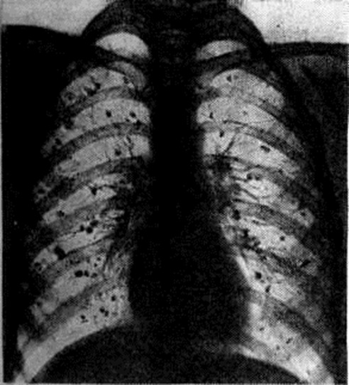 ИммунитетГистоплазмоз характеризуется развитием в инфицированном организме высокой специфической иммунологический резистентности, что обусловливает у подавляющего большинства заболевших бессимптомное или субклиническое течение инфекции, низкий уровень смертности. Гистоплазма обладает сенсибилизирующими свойствами, внутрикожная аллергическая проба с гистоплазмином (смотри полный свод знаний Кожные пробы) становится положительной через 2—3 недель после заражения и продолжает оставаться положительной на протяжении многих лет. В крови больных образуются комплементсвязывающие антитела, преципитины, агглютинины. Серологические реакции с гистоплазмином используют для определения иммунологический состояния больного. Так, положительная РСК (смотри полный свод знаний Реакция связывания комплемента) в высоких, возрастающих титрах указывает на диссеминированный Гистоплазмоз и имеет прогностическое значение. У лиц, перенёсших Гистоплазмоз, развивается обычно длительный иммунитет. Клиническая картинаИнкубационный период длится 1—2 недель, иногда больше. В связи с ингаляционным путём инфицирования наиболее часто поражаются лёгкие. Первичный внелёгочный Гистоплазмоз наблюдается очень редко, поражения кожи, слизистых оболочек, кишечника представляют обычно проявления диссеминированного Гистоплазмоз Различают два основных типа: первичный Гистоплазмоз лёгких — часто встречающийся, доброкачественный, и вторичный диссеминированный прогрессирующий Гистоплазмоз — редкий, тяжёлый, часто смертельный тип болезни. Первичный Гистоплазмоз лёгких у 80% инфицированных протекает бессимптомно. Первичный лёгочный комплекс по величине и форме очень похож на первичный туберкулёзный комплекс, выявляется в виде небольшого ограниченного субплеврального очага чаще всего в нижней и средней долях лёгких. Первичный Гистоплазмоз лёгких распознается обычно лишь методом внутрикожной пробы с гистоплазмином; но, несмотря на бессимптомное течение, у многих больных через 3—5 лет в лёгких (рисунок 4) развиваются множественные мелкие кальцинаты (обызвествление бугорков), иногда обнаруживаемые в печени и селезёнке. У 20% инфицированных первичный Гистоплазмоз лёгких сопровождается общими симптомами различной тяжести.