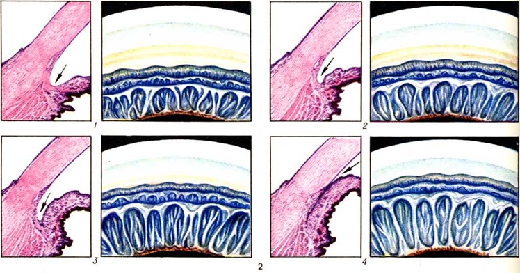 Затруднения оттока внутриглазной жидкости могут длительное время оставаться компенсированными, главным образом за счет сокращения продукции внутриглазной жидкости. Однако в ситуациях стресса состояние равновесия может легко нарушаться (напр., случаи острого приступа Глаукома при эмоциональной травме, переутомлении и так далее). Различные патогенетические элементы глазной гипертензии могут наслаиваться друг на друга. Так, например, блокада радужно-роговичного угла корнем радужки вначале является функциональной; это может привести к развитию гониосинехий и блокаде органического характера. Доказано существование наследственного предрасположения к Глаукома Повышение внутриглазного давления при вторичной Глаукома обусловлено теми же нарушениями, что и при первичной Глаукома: задержкой доступа к путям оттока внутриглазной жидкости (например, экссудатом), изменениями самих путей оттока (например, в результате воспалительного процесса и рубцевания), гиперпродукцией внутриглазной жидкости и другие В силу общности конечных патогенетических звеньев болезни границу между первичной и вторичной Глаукома нельзя считать абсолютной; с усовершенствованием диагностики все чаще удаётся выявлять причины, ведущие к изменениям в путях циркуляции внутриглазной жидкости. В результате гипертензии глаза развивается нарушение кровообращения в сосудах зрительного нерва, сетчатки и хориоидеи. Как правило, заболевают оба глаза, часто не одновременно. КлассификацияВ 1952 год на Всесоюзном совещании по Глаукома была принята классификация Глаукома, в основу которой положены три признака: клиническая форма, стадия и степень компенсации процесса. В 1975 год Всероссийским съездом офтальмологов была принята новая классификация Глаукома. По этой классификации различают три формы Глаукома: закрытоугольную, открытоугольную и смешанную. В свою очередь каждая из этих форм может иметь определённые стадии: начальную (I), развитую (II), далеко зашедшую (III) и терминальную (IV). Состояние внутриглазного давления по принятой классификации оценивается как нормальное (а), умеренно повышенное (в) и повышенное (е), а динамика зрительных функций — стабилизированная или нестабилизированная. Кроме того, выделяются: острый приступ первичной Глаукома и подозрение на Глаукома Определение формы Глаукома по новой классификации требует обязательного исследования области радужнороговичного угла (угла передней камеры глаза — цветной . рисунок 1 и 2) у каждого больного Глаукома (смотри полный свод знаний Гониоскопия). Глаукоме открытого угла обычно соответствует клинический, картина простой и хронической застойной Глаукома, глаукома закрытого угла — острому приступу Глаукома. В целом, однако, полного параллелизма между клинический, проявлениями Глаукома и гониоскопической картиной нет. Клиническая картина. В соответствии с классификацией, принятой в 1952 год, выделяют простую и застойную формы Глаукома Простая глаукома характеризуется тремя основными симптомами: повышением внутриглазного давления, снижением зрительных функций (в первую очередь сужение поля зрения), экскавацией (патологический углубление) диска зрительного нерва. Второй и третий симптомы триады являются следствиями первого и развиваются позже. Нарушение зрительных функций начинается, ка