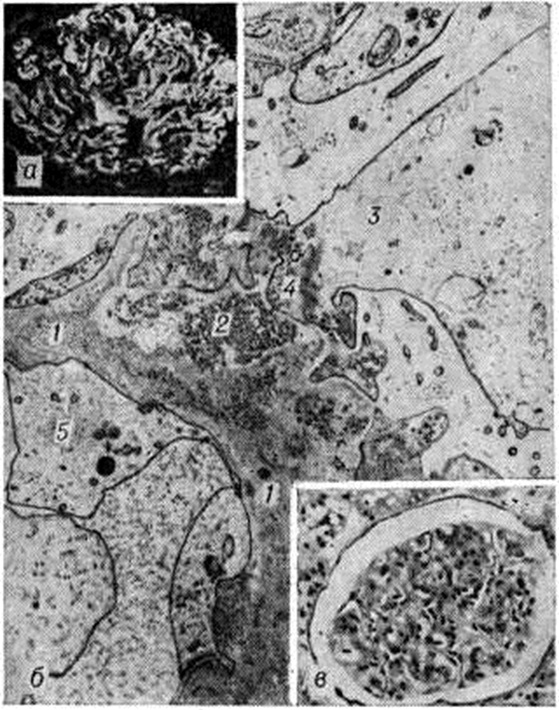 Реже ему предшествуют другие причины: пневмонии, пищевые токсикоинфекции, охлаждение, введение вакцины, сывороток, медикаментов и так далее. Реже ему предшествуют другие причины: пневмонии, пищевые токсикоинфекции, охлаждение, введение вакцины, сывороток, медикаментов и так далее. Типирование стрептококков, выделенных из зева больных Гломерулонефрит, показало, что в 78% случаев обнаруживается тип 12β-гемолитического стрептококка группы А. Преобладание 12 типа стрептококка отмечается как в спорадических случаях, так и при вспышках заболевания. В жарких странах развитию Гломерулонефрит особенно часто [в 85% случаев, по данным Диллона (Н. С. Dillon), 1967] предшествуют кожные болезни (пиодермия, импетиго, рожа); у таких больных, как правило, высеиваются пиогенные стрептококки. В сыворотке крови больных Гломерулонефрит наиболее часто обнаруживаются антитела к типу 12 стрептококка. Почти у 51% больных острым Гломерулонефрит стрептококковые антигены обнаруживаются в крови и выявляются в клубочках при иммунофлюоресцентной микроскопии [Сигал (В. С. Seegal), 1965; Андрес (G. A. Andres) с соавторами, 1966]. Часто обнаруживаются также антистрептолизин-О, антигиалуронидаза и антистрептокиназа. Однако постстрептококковый острый Гломерулонефрит с 50-х годы стал встречаться реже, что связано в значительной степени с применением мощных антибактериальных препаратов. Теснее связан со стрептококковой инфекцией Гломерулонефрит при подостром септическом эндокардите, что может проявляться не только классическим очаговым эмболическим нефритом [Лелейн (М. Н. F. Lohlein), 1910], но и диффузным поражением почек. Частота поражения почек при подостром септическом эндокардите может быть высокой — до 50%, при ревматизме (по секционным данным) — до 10,5%. Описан Гломерулонефрит и при стафилококковом эндокардите. Пневмонии осложняются Гломерулонефрит в 1—3% случаев. Роль брюшного и сыпного тифа, малярии в развитии Гломерулонефрит невелика. При малярийном нефрите находят отложение малярийного антигена в клубочках в составе иммунного комплекса наряду с иммуноглобулинами, комплементом, фибрином. При туберкулёзе клинический, картина Гломерулонефрит может оказаться ведущей. По данным В. В. Сура, А. М. Вихерта (1966), мембранозный Гломерулонефрит легко воспроизводится у животных при введении микобактериального адъюванта, то есть стимулятора процессов иммуногенеза (смотри полный свод знаний Адъюванты). Гломерулонефрит при туберкулёзе у человека описан Б. М. Коваливом и В. Ф. Подуговским (1957). Гломерулонефрит при сифилисе, протекающий обычно по нефротическому типу, редок. К инфекционно-иммунной группе Гломерулонефрит относят также малоизученные вирусные Гломерулонефрит при кори, ветряной оспе, вирусном гепатите, энтеровирусной инфекции. В группу Гломерулонефрит неинфекционно-иммунного происхождения входит Гломерулонефрит, развивающийся после ряда антигенных воздействий (сывороткой, вакциной, пыльцой растений, ядом насекомых, лекарственными и другими хим. веществами, пищевыми продуктами при индивидуальной непереносимости), а также Гломерулонефрит, возникающий при нарушении венозного оттока (частичный тромбоз почечных вен, нижней полой вены, сдавливающий перикардит, недостаточность трёхстворчатого клапана). Охлаждение, особенно при высокой влажности, может способствовать возни