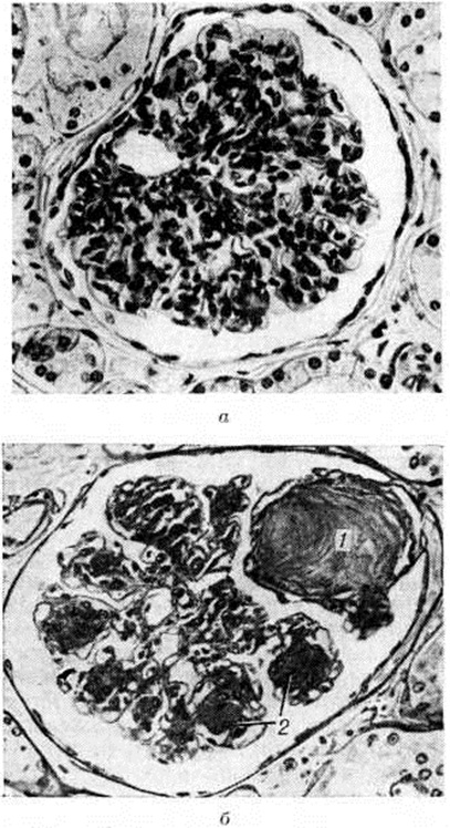 Узелковая форма характеризуется наличием в клубочках эозинофильных образований (узелков) округлой или овальной формы (рисунок 1), содержащих вакуоли. Они могут занимать часть или весь клубочек, по периферии которого в последнем случае располагаются сохранившиеся сдавленные капиллярные петли. Одновременно наблюдается расширение и аневризмы капилляров клубочков, утолщение их базальных мембран. При гистохимическом исследовании узелков они вначале окрашиваются как фибрин, а в дальнейшем как коллаген. Узелки содержат большое количество высокомолекулярных мукополисахаридов, небольшое количество кислых мукополисахаридов, жировых субстанций, в основном ненасыщенных жирных кислот и холестеринэстеров. При электронно-микроскопическом исследовании видно, что формирование узелков происходит в мезангии в виде скопления в нем глыбок и трабекул, сходных с веществом базальной мембраны.