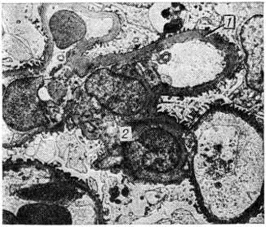 Смешанная форма характеризуется сочетанием типичных узелков с диффузным уплотнением мезангия и утолщением базальных мембран капилляров клубочков (рисунок 3). По данным электронно-микроскопических исследований утолщение базальных мембран капилляров клубочков возникает рано, нередко до появления каких-либо клинических проявлений поражения почек, и имеет место, видимо, при всех формах Гломерулосклероз диабетический Утолщение мембран наблюдается не только у больных, но и у молодых людей из диабетически отягощённых семей.
