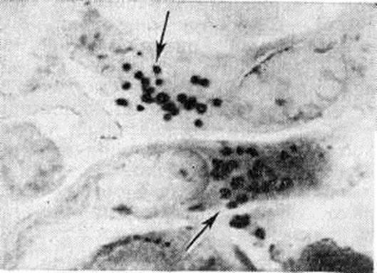 Постгриппозные изменения в органах дыхания (11—30-й день) характеризуются разрастаниями и дифференцировкой пролиферирующих эпителиальных клеток бронхов. В участках ателектаза образуются мелкие полости, соответствующие альвеолам, выстланные кубическим эпителием с эозинофильной цитоплазмой. В просветах таких полостей содержится слизь, нейтрофильные лейкоциты с примесью погибших клеток и микробной флоры. Образование таких структур может способствовать развитию постгриппозных бактериальных пневмоний. В дальнейшем дифференцировка эпителиальных разрастаний происходит неравномерно, и на более поздних сроках в лёгких можно видеть островки кубического эпителия, напоминающие гигантские клетки (рисунок 4). Это, по-видимому, давало повод называть пневмонии, возникающие в этот период, гигантоклеточными неизвестной этиологии. В других внутренних органах, особенно при тяжёлом Грипп, наблюдаются разнообразные дистрофические изменения, связанные с циркуляторными расстройствами. Отмечается острое набухание головного мозга (смотри полный свод знаний Отёк и набухание головного мозга), выражающееся явлениями стаза, кровоизлияниями (цветной рисунок 1) и дистрофическими изменениями клеток коры, иногда с лимфоидной инфильтрацией. Эти явления, ошибочно рассматривавшиеся ранее как гриппозный энцефалит, расцениваются как результат гриппозного нейротоксикоза. В симпатических ганглиях и стволах периферических нервов определяются дистрофические изменения. В сердце при Грипп обнаруживаются дистрофические изменения мышечных волокон и нервных клеток интрамуральных ганглиев. Дистрофические и воспалительные изменения в сосудах иногда сочетаются с тромбозом вен (смотри полный свод знаний Тромбоз). В печени наряду с дистрофическими изменениями гепатоцитов нередко отмечается диффузная гиперплазия и про, лиферация купферовских клеток, круглоклеточная инфильтрация соединительнотканных прослоек. Смерть при Грипп чаще всего связана с присоединением бактериальных нагноительных процессов, а также с собственно вирусным токсикозом, выражающимся в резких и острейших циркуляторных расстройствах. ИммунитетЧеловек не обладает врождённым иммунитетом к Грипп. Лишь у новорожденных имеются антитела к Грипп, получаемые при внутриутробном развитии от матери и исчезающие к 7-му мес. жизни. Приобретённый иммунитет при Грипп типо и штаммоспецифичен. Антигенные варианты вируса гриппа типа А вызывают только частичный перекрёстный иммунитет. Антитела к возбудителю появляются уже на 2—3 суток от начала болезни и достигают наиболее высокого уровня на 10—14-й день. Приобретённый иммунитет при гриппе типа С сохраняется, по-видимому, пожизненно, иммунитет к гриппу типа В — 3—5 лет, к гриппу типа А — 1—2 года. К гомологичным штаммам гриппа типа А иммунитет более прочен и продолжителен. Приобретённый иммунитет обеспечивают два вида факторов — местные (секреторные) и общие (гуморальные). К неспецифическим факторам иммунитета относятся кофакторы (смотри полный свод знаний Иммунитет противовирусный), сывороточные ингибиторы (смотри полный свод знаний) и интерферон (смотри полный свод знаний), которые снижают вероятность заболевания Грипп Клиническая картинаИнкубационный период при гриппе типа А — от нескольких часов до двух суток, при гриппе типа В 