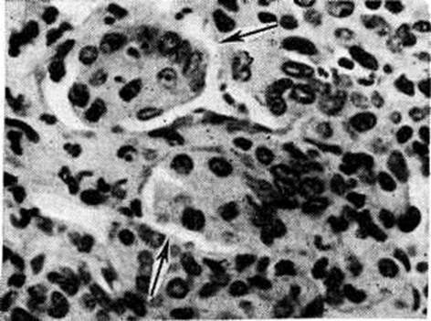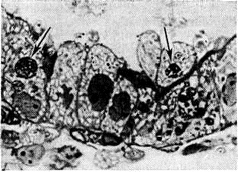 Патологическая анатомияМорфологически изменения при Грипп выражаются повреждениями органов дыхания и токсическим поражением других органов и систем. Выраженность этих изменений зависит от вирулентности возбудителя, состояния специфического и неспецифического иммунитета, а также от характера сопутствующих болезней и бактериальных осложнений. Для местных изменений при Грипп характерны слизистая и вакуольная дистрофия эпителия, частичная гибель его на протяжении дыхательных путей с последующими реактивными изменениями. Характерен серозный, катарально-гнойный, геморрагический и некротический ринит (смотри полный свод знаний), ларингит (смотри полный свод знаний) и трахеобронхит (смотри полный свод знаний Трахеит). В мазках-отпечатках со средней носовой раковины обнаруживается большое количество дистрофизированных клеток цилиндрического эпителия, в цитоплазме которых нередко обнаруживаются оксифильные включения. Наиболее резко поражаются подсвязочная область гортани, трахеи и крупные бронхи (рисунок 1), а также слизистая оболочка языка. Слизистая оболочка — огненно-красная, нередки точечные кровоизлияния и островки желтоватого цвета (очаги некрозов). В более тяжёлых случаях слизистая оболочка трахеи и крупных бронхов на всем протяжении серовато-жёлтого цвета, с небольшими участками кровоизлияний (цветной рисунок 2 и 3). Гистологически эпителий трахеи и бронхов принимает вид аркадообразных структур, возникающих за счёт отёка (смотри полный свод знаний), вакуолизации (смотри полный свод знаний) и отслойки поверхностных слоёв клеток, содержащих вирусный антиген. Часто наблюдается образование фуксинофильных цитоплазматических включений (рисунок 2) и развитие регенераторных (псевдометапластических) процессов. Клетки бронхиального эпителия под действием вируса Грипп теряют ворсинки, количество гранул в них резко уменьшается. Цитоплазматические включения представляют собой аутофагосомы, образующиеся в зоне парциального некроза цитоплазмы вследствие репродукции вируса Грипп (рисунок 3). Резкое полнокровие, отёк и круглоклеточная инфильтрация подэпителиальных слоёв сочетается с утолщением базальной мембраны и усилением секреции образующих слизь желёз. В других местах отмечается гибель эпителия, выраженное полнокровие и лейкоцитарная инфильтрация субэпителиального слоя бронхов и гнойный экссудат с колониями микробов в просвете дыхательных путей. Такого рода очаги гнойно-некротического трахеобронхита служат источником бактериальных поражений лёгочной ткани. При макроскопическом изучении в лёгких отмечается резкое полнокровие, отёк, очаги острой эмфиземы (смотри полный свод знаний Эмфизема лёгких), нередки участки уплотнения интенсивно-красного цвета с гладкой поверхностью разреза, а также гнойный бронхит (смотри полный свод знаний) и бронхиолит (смотри полный свод знаний), участки гнойной, абсцедирующей пневмонии и плевриты (цветной рисунок 3), обычно развивающиеся в случаях присоединения бактериальной, чаще стафилококковой, инфекции («пёстрые» гриппозные лёгкие). Гистологически часто обнаруживают очаги ателектаза, утолщение межальвеолярных перегородок за счёт белкового пропитывания и полнокровия, дистрофию и десквамацию альвеолоцитов. В просвете альвеол, кроме разрушающихся альвеолоцито
