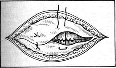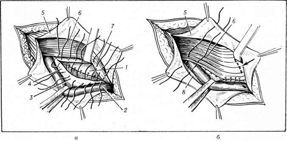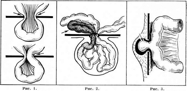 Лечение ущемлённой Грыжи всегда оперативное, и, так как опасность омертвения ущемлённых органов с каждым часом возрастает, операция должна быть неотложной. По данным Н. С. Утешева (1972), в первые 6 часов от момента ущемления в стационар поступает 58,3% больных, в сроки от 6 до 24 часов — 26,7%, остальные больные поступают позже 24 часов. Попытки вправления ущемлённой Грыжи недопустимы. Однако вправление ущемлённой Грыжи при кахексии, свежем инфаркте миокарда, дыхательной или сердечной декомпенсации возможно, но не позднее 2 часов от момента ущемления. Бескровное вправление допускается в течение 1—2 часов после ущемления путём опорожнения мочевого пузыря и кишечника, приподнимания таза, назначения тёплой грелки, введения морфина. Ручной способ может привести к мнимому вправлению Грыжи в предбрюшинную клетчатку вместе с ущемляющим кольцом (рисунок 4). Операция при ущемлённой Грыжи может быть сложной в связи с необходимостью резекции кишки при её некрозе. В этих случаях оперировать лучше под наркозом. При местной анестезии пользуются методом ползучего инфильтрата по А. В. Вишневскому (смотри полный свод знаний Анестезия местная) с обильным пропитыванием раствором новокаина и рассечением тканей строго последовательно. При операции ущемлённой Грыжи стенку мешка рассекают осторожно, чтобы не повредить внутренностей, особенно при отсутствии в нем грыжевой воды. Ущемлённые органы захватывают салфеткой, только после этого рассекают снаружи внутрь ущемляющее кольцо. При этом надо помнить о возможности ранения сосудов и сращённых с шейкой грыжевого мешка внутренностей. По рассечении кольца ущемлённые внутренности выводят наружу для осмотра странгуляционной борозды и части органов, находившейся в брюшной полости. При сдавлении только венозных сосудов кишка синюшна, но после рассечения ущемляющего кольца принимает обычную окраску. При сдавлении же артерий или тромбировании их наступает омертвение кишечной петли, и тогда она выглядит чёрной, тусклой, лишённой тонуса и перистальтики, сосуды брыжейки не пульсируют. Иногда в месте некроза видно прободное отверстие. Очень трудно распознаются переходные стадии. В этих случаях в целях определения жизнеспособности кишечной петли применяют термометрию, просвечивание (трансиллюминацию). Если, несмотря на согревание ущемлённой кишки путём обкладывания салфетками, смоченными тёплым (t°40—45°) физиологический раствором, кишка не розовеет и её перистальтика и пульсация сосудов брыжейки не восстанавливаются, кишку считают нежизнеспособной и резецируют, для чего лучше перейти к лапаротомии под наркозом. При восстановлении нормального цвета, перистальтики и пульсации сосудов брыжейки кишку вправляют в брюшную полость. Резекцию ущемлённой кишки производят с удалением не менее 30— 40 сантиметров неизменённого приводящего и 15—20 сантиметров отводящего отрезка от границы ущемления. Сшивание резецированной кишки производят обычно конец в конец, а при узком просвете отводящего её отрезка некоторые хирурги предпочитают наложение соустья бок в бок. Ущемлённый сальник резецируют. Ущемление других органов (помимо кишки и сальника) встречается редко. Описаны ущемления червеобразного отростка, внутренних женских половых органов, стенки мочевого пузыря, appendices epiploicae. Находящийся в грыжевом мешке 