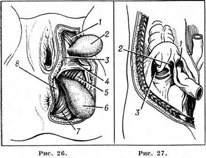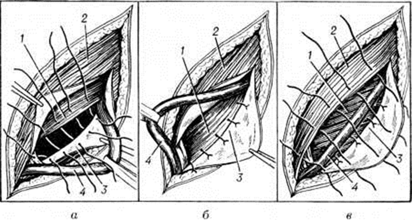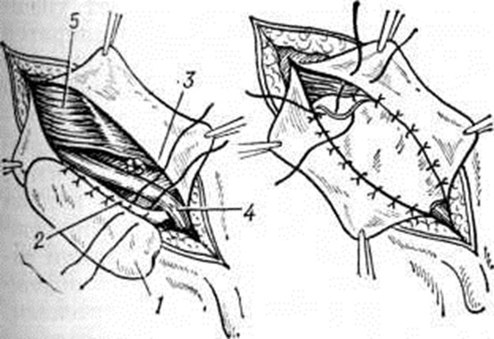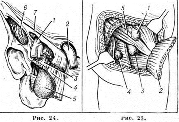 У женщин паховая Грыжи встречается реже, но ущемление её наблюдается относительно чаще. Нахождение маточной трубы, яичника в грыжевом мешке вызывает боли, усиливающиеся при менструации. Описаны случаи нахождения в грыжевом мешке беременной матки. Правильное распознавание находящихся в грыжевом мешке внутренних половых органов возможно только при влагалищном исследовании. Особенностью операции грыжесечения у женщин является то, что у них наглухо зашивают паховый канал. Рецидивы паховых грыж после хирургического лечения бывают часто. Частота рецидивов при косых паховых грыжах колеблется в пределах 3—15% , при прямых паховых грыжах частота рецидивов, по данным ряда авторов, составляет 15— 35%. Основными моментами, играющими роль в возникновении рецидива, являются нагноение раны, обширная гематома, неполное удаление грыжевого мешка, повреждение подвздошно-пахового и подвздошно-подчревного нервов, преждевременная физических нагрузка после операции и другие Причиной более частого рецидивирования прямых паховых Грыжи являются недостаточно надёжное пластическое укрепление области грыжевых ворот, в частности плохое укрепление высокого пахового промежутка, оставление незашитой поперечной фасции и некоторые другие моменты. При операции рецидивной Грыжи все рубцы должны быть иссечены для восстановления анатомических соотношений элементов пахового канала. Способ пластики его выбирают в зависимости от сохранности тканей и вида Грыжи, особенно рекомендуется способ Н. И. Кукуджанова. При больших рецидивных Грыжи и невозможности надёжной пластики местными тканями применяют аллопластику (рисунок 14) с укреплением слабого места брюшной стенки лоскутом из синтетического материала (Б. В. Петровский, 1958). При многократно рецидивирующей Грыжи для создания новой паховой связки рекомендуют использовать гетерогенную брюшину. Большинство хирургов удлиняет срок пребывания в постели после операции при рецидивных Грыжи до 2 недель. Бедренная грыжа (hernia cruralis, s. femoralis) занимает по частоте второе место после паховых. Чаще встречается у женщин в возрасте 40—60 лет. Предрасположением к образованию бедренной Грыжи является увеличение размеров и анатомическая слабость глубокого бедренного кольца, так как при увеличении промежутка между бедренной веной и лакунарной связкой уменьшается прочность этой области. Вследствие большей ширины таза эти особенности больше выражены у женщины. Наличие дивертикула брюшины в бедренном канале (смотри полный свод знаний), в который опускаются внутренности, создаёт условия для быстрого развития бедренной Грыжи А. П. Крымов различает три разновидности бедренной Грыжи: 1) выходящая через сосудистую лакуну — сосудисто-лакунарная Грыжи (рисунок 15,3); 2) проходящая через лакунарную связку — грыжа Ложье; 3) Грыжи, проходящая через мышечную лакуну (рисунок 15,1) — грыжа Гессельбаха (мышечно-лакунарная бедренная Грыжи, спускающаяся во влагалище т. iliopsoas). В свою очередь сосудисто-лакунарная бедренная Грыжи имеет четыре разновидности. 1. Полная сосудистолакунарная Грыжи, занимающая всю сосудистую лакуну. 2. Грыжи части сосудистой лакуны со следующими вариантами: а) медиальная сосудистолакунарная бедренная Грыжи — наиболее частая разновидность бедренной Грыжи; б) межвлагалищная сосудисто-лакунарная бедренная Гр