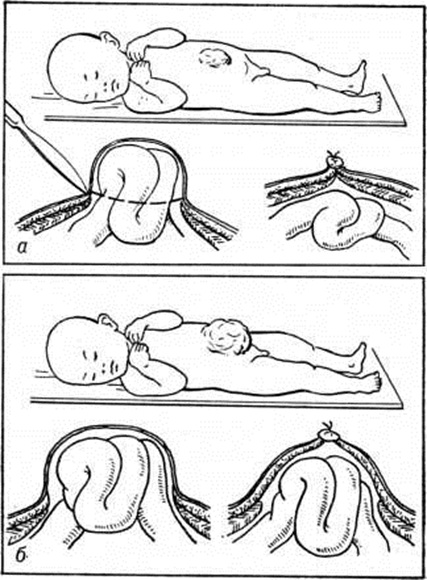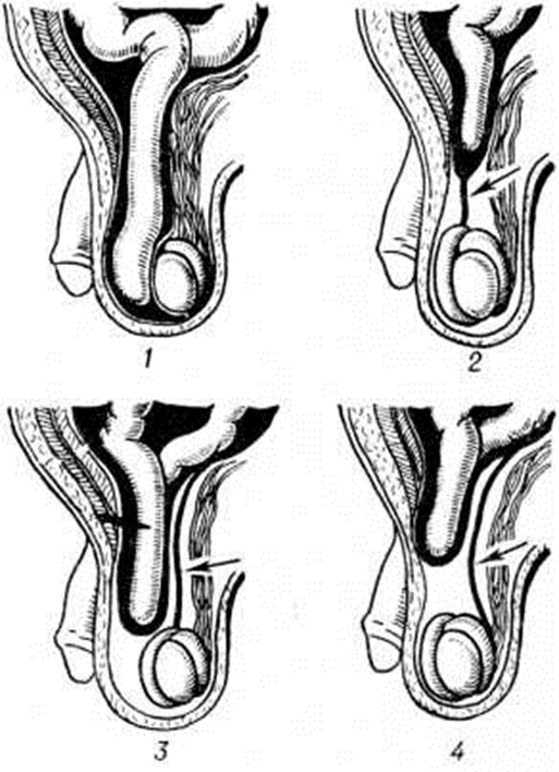 Паховая грыжа у детей, как правило, является врождённым заболеванием. По данным ряда авторов, только у 20—25% новорожденных мальчиков отмечается полное заращение влагалищного отростка брюшины (Н. И. Кукуджанов, 1969). При повышении внутрибрюшного давления у новорожденных (крик, натуживание) возникают условия для развития Грыжи. У девочек паховые Грыжи образуются примерно в 10 раз реже, чем у мальчиков. Паховые Грыжи у детей бывают, как правило, косыми (рисунок 28). Если влагалищный отросток брюшины остаётся не облитерированным на всем протяжении и грыжевое содержимое распространяется непосредственно до яичка и дна мошонки, то формируется так называемый яичковая врождённая паховая Грыжи (около 10% паховых Грыжи у детей). Если же влагалищный отросток брюшины частично облитерируется в дистальной части, то формируется так называемый канатиковая (фуникулярная) врождённая паховая Грыжи (около 90% паховых Грыжи у детей). Незаращение влагалищного отростка брюшины может сопровождаться задержкой яичка в брюшной полости или в паховом канале — крипторхизм (смотри полный свод знаний). Сочетание крипторхизма с врождённой косой паховой Грыжи имеет место в 35—55% случаев (Е. С. Шахбазян, 1957). По существу, каждый случай крипторхизма сопровождается потенциальной паховой Грыжи (Н. И. Кукуджанов, 1969). Клиническая картина свободной Грыжи характеризуется появлением безболезненного выпячивания мягкой консистенции в паховой области, увеличивающегося при беспокойстве, крике и уменьшающегося в размерах в спокойном состоянии ребёнка. В положении ребёнка лёжа содержимое грыжевого мешка удаётся легко вправить и пальпировать расширение поверхностного пахового кольца. При очень больших пахово-мошоночных Грыжи отмечается «выпрямление» пахового канала, и палец исследующего через расширенные паховые кольца может свободно пройти в брюшную полость. Большие пахово-мошоночные Грыжи у детей, по данным отдельных авторов (А. Т. Пулатов, 1967), составляют До 20%. Паховая Грыжи отличается от водянки яичка (смотри полный свод знаний Гидроцеле) и варикоцеле (смотри полный свод знаний) вправимостью, тимпаническим звуком при перкуссии грыжевого выпячивания и наличием перистальтических шумов при аускультации. Кроме того, в отличие от водянки яичка, при паховой Грыжи невозможно определить верхний полюс грыжевого выпячивания, удаётся прощупать яичко, симптом просвечивания отрицательный. Единственным методом лечения паховых грыж у детей является оперативное вмешательство. Применение бандажа у детей не показано. Оперативное лечение свободных паховых Грыжи принято проводить в возрасте старше 1 года. Если Грыжи подвержена частым ущемлениям, показания к операции возникают и в более раннем возрасте (лучше позже 6 месяцев). У детей до 3—5 лет при паховых Грыжи общепринятый способ грыжесечения — высокое сечение грыжевого мешка с пластикой пахового канала по Ру — Краснобаеву (рисунок 29). У детей старшего возраста при паховой Грыжи производят грыжесечение с пластикой по Мартынову. По данным литературы, рецидивирование Грыжи у детей после операции бывает часто (от 1,2 до 3,8%), поэтому ряд авторов при больших паховомошоночных Грыжи у детей предлагает укрепление и задней стенки пахового канала. Ущемление паховой Грыжи у детей возникает в результате резкого повышения внутрибрюшног