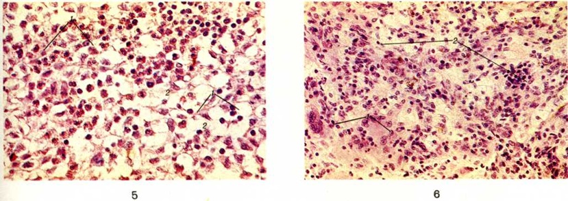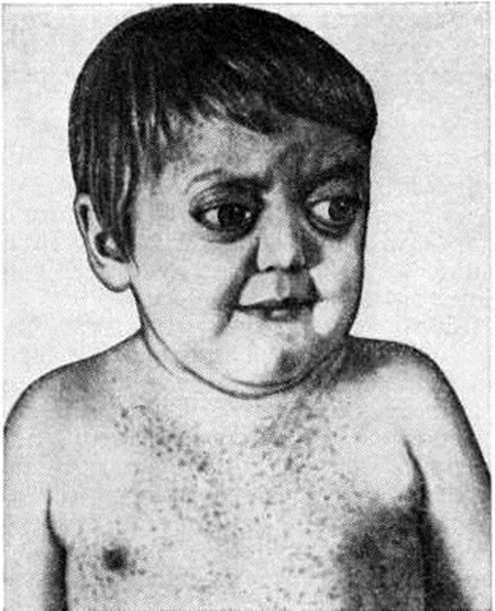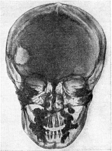 Клиническая картина. При поражении костей черепа и таза частый симптом болезни — боли в костях. При поражении височной кости может развиваться неинфекционный средний отит (смотри полный свод знаний), устойчивый к антибактериальной терапии. Вследствие деструкции костей глазницы возникает экзофтальм (рисунок 1), при разрушении турецкого седла отмечается нарушение функции гипофиза, гипоталамуса с явлениями несахарного диабета (смотри полный свод знаний: Диабет несахарный). Деструкция костей челюстей способствует расшатыванию зубов, их выпадению, оголению корней зубов, развитию вторичного гингивита (смотри полный свод знаний), стоматита (смотри полный свод знаний). У 50—60% больных наблюдаются поражения кожи в виде ксантом, окрашенных в жёлто-коричневый цвет (смотри полный свод знаний: Ксантома), везикул, изъязвлений, геморрагий. При вовлечении в процесс лёгких отмечаются кашель, одышка. Заболевание может иметь хронический течение и медленно прогрессировать. Возможна диссеминация процесса с поражением лимфатических, узлов, печени, селезёнки и других органов. В крови иногда отмечается умеренная анемия (смотри полный свод знаний), панцитопения (смотри полный свод знаний: Гипопластическая анемия); в костномозговом пунктате — сохранность мегакарноцитов, иногда инфильтрация гистиоцитарными элементами. В редких случаях осложнениями являются патологический переломы. Так, поражение позвоночника может привести к компрессионному перелому позвонков (смотри полный свод знаний: Позвоночник), вызвать сдавление спинного мозга и корешковые симптомы (смотри полный свод знаний: Спинной мозг). Диагноз устанавливают на основании клинические, картины, результатов цитологический и гистологический исследования очагов поражения, а также рентгенологическое исследования костей. В пунктате опухолевых образований кожи и мягких тканей выявляют инфильтрацию атипичными гистиоцитарными клетками с макрофагальной функцией, признаки эритрофагоцитоза; по мере прогрессирования заболевания такие инфильтраты обнаруживают в костном мозге. Рентгенологические картина характеризуется преимущественным поражением костей черепа (рисунок 2), таза, реже в процесс вовлекаются позвонки, ребра и длинные трубчатые кости (бедренные, плечевые, кости голени). В костях свода черепа образуются множественные дефекты неправильно округлой или овальной формы с чётко очерченными изъеденными контурами без признаков остеопороза и реактивных склеротических изменений по периферии. Размеры очагов варьируют, иногда очаги занимают обширные участки кости. Деструктивные процессы в области пирамиды, сосцевидного отростка и других отделов височной кости являются причиной поражения уха. Турецкое седло, как правило, не изменено. В ряде случаев выявляется небольшое его уплотнение. Из костей лицевого черепа изменения чаще обнаруживаются в челюстях, особенно в верхней. При поражении альвеолярных отростков наблюдается расширение зубных альвеол. В области таза очаги деструкции локализуются преимущественно в крыльях подвздошных костей. Поражение позвонков чаще бывает одиночным, встречается преимущественно в средней и нижней части грудного отдела позвоночника. Иногда развивается компрессия тел позвонков с образованием платибрахиспондилии (смотри полный свод знаний: 