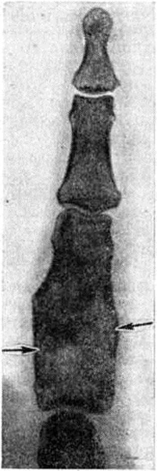 Диагноз устанавливают на основании клинические, картины, данных рентгенологическое исследования и результатов биопсии. Рентгенологические картина довольно характерна. В губчатом веществе кости определяется участок деструкции костной ткани с ровными контурами. Очаг располагается несколько эксцентрически в области эпифиза, со стороны эпифизарного хряща, и распространяется на компактное вещество кости. Иногда очаг хондробластомы может быть немного смещён в направлении метафиза. Корковое вещество на уровне опухоли истончено п подрыто, но, как правило, слой его сохраняет непрерывность (рисунок 1). На фоне деструкции выявляются в виде крапа включения солей кальция. Иногда дефект костной ткани пронизывают отдельные костные перегородки, придающие ему вид многокамерной кисты. На уровне участка поражения кость, как правило, утолщена, как бы вздута. Периостальные наслоения выражены слабо. При значительных размерах опухоли в поражённой кости определяется конгломерат хрящевой ткани с зонами обызвествления, который чётко отграничен от окружающих опухоль мягких тканей (рисунок 2).