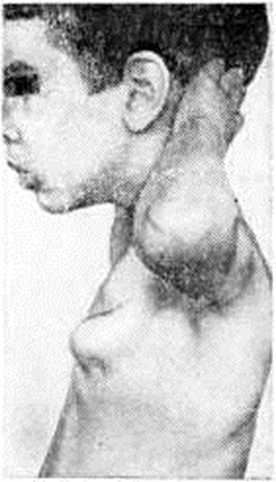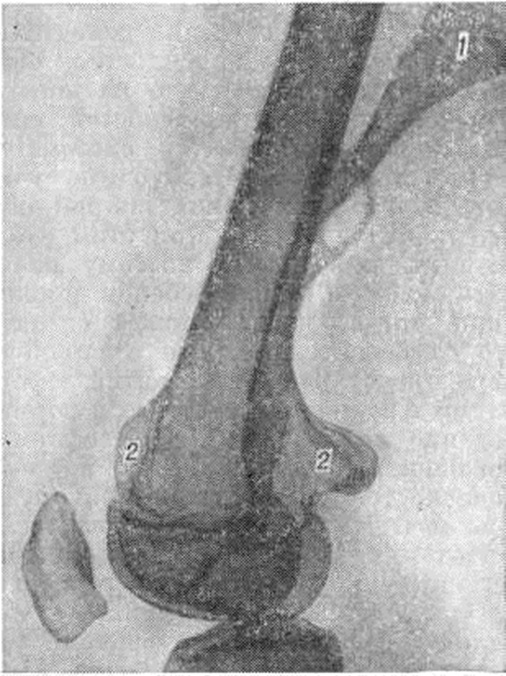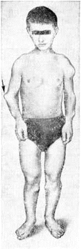 Заболевание возникает в детском возрасте. Основной клинические, признак — растущее безболезненное образование костной плотности, которое располагается обычно на медиальной стороне поражённого эпифиза. Несмотря на увеличение длины одного из сегментов, общая длина конечности не увеличена в связи с укорочением смежного сегмента. Постепенно наступает деформация конечности (рисунок 1) с явлениями артроза (смотри полный свод знаний), сопровождающаяся болями, хромотой. Рентгенологически определяют нарушение конгруэнтности суставных поверхностей, выявляют увеличенную часть поражённого эпифиза, наличие в нем очагов уплотнения и просветления различной величины и формы. Лечение оперативное, его рекомендуют производить до развития вторичных деформаций. Оперативное вмешательство состоит в удалении избыточных костно-хрящевых разрастаний в пределах здоровой кости.