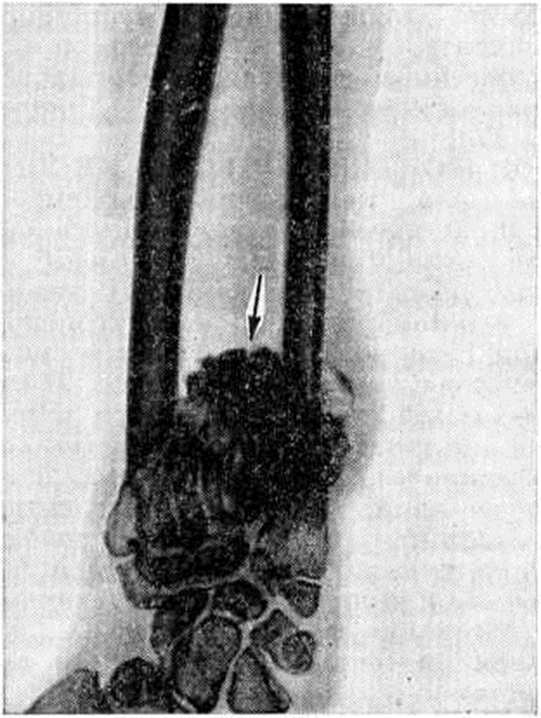Форма экзостоза, выявляемая при рентгенологическое исследовании, зависит от его локализации. Экзостозы, располагающиеся в проксимальном отделе плечевой кости и в дистальном отделе большеберцовой кости, имеют широкое основание и холмовидную форму (рисунок 6), они как бы распластаны по кости; в их основании много хрящевой ткани. В дистальном метафизе бедра и проксимальном метафизе большеберцовой кости образуются экзостозы с узкой длинной ножкой — линейные экзостозы (рисунок 9). Тело их вытянуто; оно состоит из губчатой кости и обызвествляющегося хряща, на вершине имеется хрящевой чехол. В проксимальном отделе малоберцовой кости, дистальном отделе костей предплечья, в области малого вертела бедра экзостозы имеют шаровидную форму; кости приобретают вздутый, пенистый вид, а многочисленные, сферически располагающиеся отложения солей кальция придают им сходство с цветной капустой (рисунок 10). Экзостозы имеют чёткие контуры за счёт компактной костной пластинки. Структурный рисунок экзостозов веерообразный; главные трабекулы располагаются узким пучком в ножке и как бы рассыпаются к его поверхности. В холмовидных экзостозах структурный рисунок груботрабекулярный. В линейных — более толстые пластинки идут параллельно длиннику кости и поверхности экзостоза. Метафизы костей расширены, удлинены, имеют характерные деформации: вальгусную — в области шейки, проксимального и дистального конца бедренной кости и проксимального конца большеберцовой, варусную — в области костей предплечья. В ряде случаев на рентгенограмме можно обнаружить переломы экзостозов, особенно линейных и шаровидных с узкими ножками. Клинико-рентгенологическая картина множественных экзостозов характерна и не похожа ни на одно другое заболевание скелета. Одиночные экзостозы могут быть приняты за остеому, а при болях — и за остеогенную саркому или хондросаркому, однако рентгенологическое исследование позволяет отвергнуть это предположение. Одиночные экзостозы дифференцируют с гетеротопическими оссификатами и оссифицирующейся гематомой. Указанные патологический образования чаще локализуются у локтевого сустава и не имеют чёткой направленности роста к центру диафиза. Лечение оперативное. Одиночные экзостозы удаляют после их перемещения на диафиз, когда они уже не связаны с эпифизарной зоной роста, повреждение которой может привести к преждевременному её закрытию и деформации конечности. При множественных экзостозах удаляют только те, которые вызывают боль, оказывают давление на сосудисто-нервные пучки, соседние кости или быстро растут. Операция заключается в удалении экзостоза вместе с надкостницей и хрящевым чехлом в пределах здоровой кости. По показаниям, например, при искривлении поражённой кости, удаление экзостозов можно сочетать с корригирующей остеотомией. В случае недоразвития зоны роста или всего эпифиза после удаления экзостоза укороченную и деформированную кость удлиняют и выравнивают с помощью остеотомии или компрессионно-дистракционного аппарата. Эту методику особенно часто применяют при удалении экзостозов, локализующихся в области предплечья и голени. Прогноз для жизни благоприятный. При запущенных больших экзостозах, вызвавших тяжёлые вторичные деформации, прогноз в отношении функции конечности неблагоприятный. 