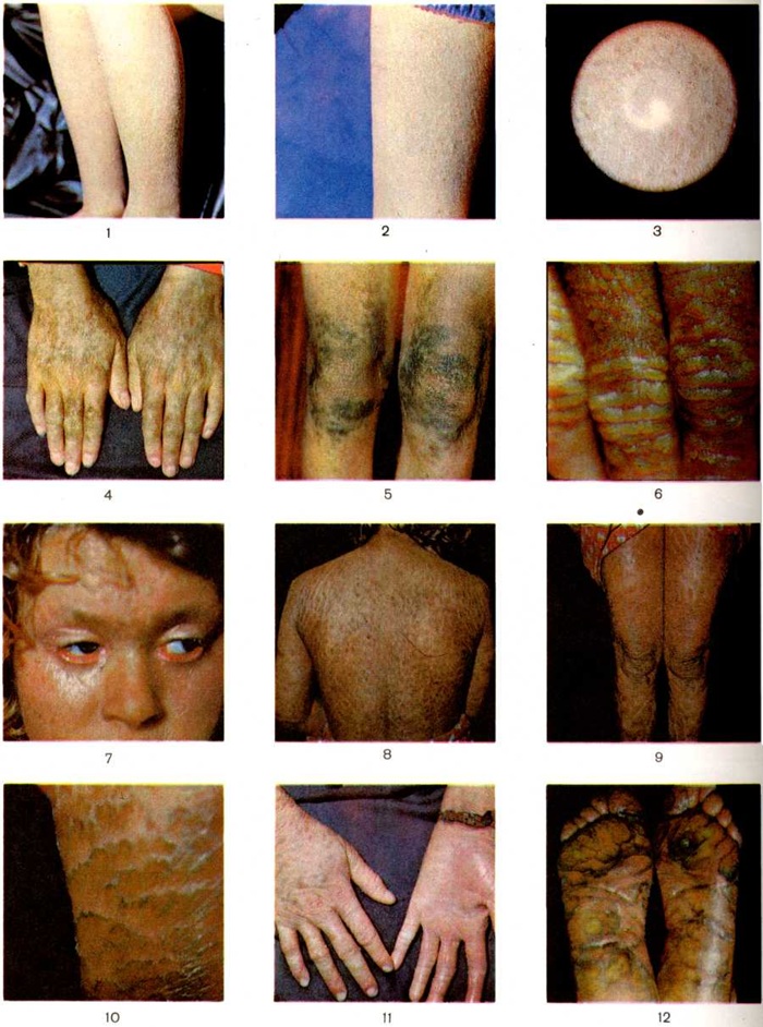 Клиническая картина. Вследствие гиперкератоза и постоянного образования чешуек кожа становится сухой, шершавой на ощупь, сморщенной, грязно-серого цвета. Патологический изменения кожи особенно выражены в области локтевых, коленных суставов, разгибательной поверхности плеч, предплечий, голеней (цветной рисунок 1—3) и бёдер. Кожа больших складок (локтевые и подколенные сгибы, подмышечная впадина, межъягодичная складка) и половых органов, как правило, не поражается. На лбу и щеках гиперкератоз появляется обычно лишь у взрослых. На ладонях и подошвах подчёркнуты кожные линии и складки. На коже волосистой части головы — отрубевидное шелушение, волосы несколько истончаются, возможно поредение волос. Описаны также различные триходисплази и: бамбукообразные волосы, узловатая ломкость, разволокнение коркового слоя волос. Ногтевые пластины становятся сухими, ломкими, шероховатыми с поперечной исчерченностью, деформируются, может развиться онихогрифоз (ногти, напоминающие когти птиц). Наблюдается снижение сало и потовыделения на участках гиперкератоза; дермографизм и мышечно-волосковый рефлекс выражены слабо или не вызываются. Иногда беспокоит зуд, познабливание. Обыкновенный Ихтиоз длится всю жизнь, состояние больного ухудшается в зимнее время и несколько улучшается в летнее. Клин, проявления Ихтиоз несколько ослабевают в период полового созревания и в зрелом возрасте. Общее состояние больных, как правило, не страдает. Обыкновенный Ихтиоз нередко сочетается с заболеваниями аллергического генеза — нейродермитом, экземой, бронхиальной астмой, вазомоторным ринитом, а также псориазом, пиодермией, крипторхизмом и другие В зависимости от вида и степени образования чешуек различают следующие клинический, варианты обыкновенного Ихтиоз: а) Ихтиоз абортивный (син.: ксеродерма, ксеродермия) — наиболее лёгкая разновидность Ихтиоз, характеризующаяся сухостью, шероховатостью кожи преимущественно разгибательной поверхности конечностей, ягодиц за счёт перифолликулярно расположенных мелких отрубевидных чешуек. Если провести по коже шпателем или ногтем, появляется белая полоса муковидного шелушения. Кожа легко раздражается, особенно при мытье мылом, и предрасположена к экзематизации; б) Ихтиоз простой — характеризуется мелкими чешуйками серовато-белого цвета, центральная часть которых плотно прикреплена к коже, роговой слой кожи напоминает растрескавшийся пергамент; в) Ихтиоз блестящий — отличается прозрачностью и нежностью чешуек, располагающихся в виде мозаики, главным образом на конечностях; г) Ихтиоз белый — характеризуется белым цветом чешуек, создающих впечатление, что кожа обсыпана мукой; д) буллезный Ихтиоз— редкая атипичная разновидность, описан Сименсом (Н. W. Siemens, 1937), характеризуется появлением пузырей с серозным содержимым на фоне ихтиозных изменений кожи; е) редко наблюдается локализованный Ихтиоз — поражается ограниченный участок кожи; возможны переходные и смешанные варианты. Ихтиоз Х-сцепленный рецессивный выделен как самостоятельная форма из обыкновенного Ихтиоз с помощью генетических исследований Коккейном (Е. A. Cockayne, 1933). Клин, и гистологический особенности этой формы Ихтиоз были чётко описаны Уэллсом (1965), Керром (1966), Куокканеном (К. Kuokkanen, 1969) и другие Болеют только мужчины; женщины (гетерозиготы) п