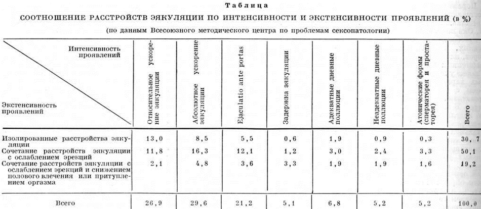 В основе подобной дисгармонии обычно лежит недопонимание мужчиной психосексуальных особенностей женщины, недооценка ин подготовительной и заключительной фаз коитуса, важности для женщины «музыки слов», качественной стороны интимного сближения. В группе нарушений нейрогуморальной составляющей копулятивного цикла следует различать плюригландулярные поражения, на которые приходится 12,7% всех сексуальных расстройств (в том числе па нарушение темпа пубертатного развития — 2 %, на инволюционные формы — 8,5%, на прочие формы , 2,2%), и специфические синдромы, составляющие 15,2% сексуальных расстройств (в том числе на диэнцефальную Импотенция и другие поражения глубоки структур мозга — 8,5% и формы с преимущественным поражением отдельных эндокринных желёз— 6,7%). Поражения психической составляющей копулятивного цикла представляют самую частую форму Импотенция Они подразделяются на синдромы с преобладанием эндогенных (врождённых, конституциональных) факторов, наблюдаемые при психопатии, эндогенных психозах, олигофрении, а также у лиц с акцентуацией отдельных характерологических свойств, и синдромы с преобладанием экзогенных (реактивных, ситуационных) факторов. В этой группе синдромов можно выделить варианты с первичным, непосредственным поражением сексуальной сферы, представленные случаями «невроза ожидания неудачи», превращения естественных сексуальных раздражителей в условный тормоз, нарушения психосексуальной ориентации вследствие ошибочного определения паспортного пола и тому подобное, и варианты с вторичным вовлечением сексуальной сферы в картину невроза (например, неврастении), соматогенных астенических и депрессивных состояний, экзогенных психозов. При психогенных формах с первичным вовлечением сексуальной сферы психическая травма, глубоко ранящая самолюбие и затрагивающая особо чувствительные стороны личности, предшествует развитию расстройств и является основным этиологического фактором, который определяет всю клинический, картину. В рамках «общего» невроза сексуальные нарушения, в частности расстройства эякуляции, обусловлены факторами, не связанными непосредственно с сексуальной сферой (недосыпание, переутомление, конфликты на работе и другие), и им обычно предшествуют общеневротические симптомы (раздражительность, утомляемость, трудность сосредоточения, головные боли, расстройства сна и так далее). К синдромам поражения эрекционной составляющей копулятивного цикла (около 1%) относятся клинический, варианты Импотенция, которые характеризуются спинальной локализацией патологический очага (миелит, рассеянный склероз, опухоли, травмы спинного мозга и другие), некоторыми экстраспинальными поражениями (каудит, плексит, неврит, опухоли и другие) либо обусловлены заболеваниями и повреждениями полового члена. Нарушения эякуляторной составляющей копулятивного цикла (21,3%) охватывают синдромы, обусловленные первичным урологический заболеванием, вторичной патогенетической дезинтеграцией (изменением отношений между нервными центрами, сохраняющимся после ликвидации урологический заболевания) и первичной патогенетической дезинтеграцией, в основе которой лежит поражение высших кортикальных центров регуляции функции мочевого пузыря и половых функций (синдром парацентральных долек). Синдром п