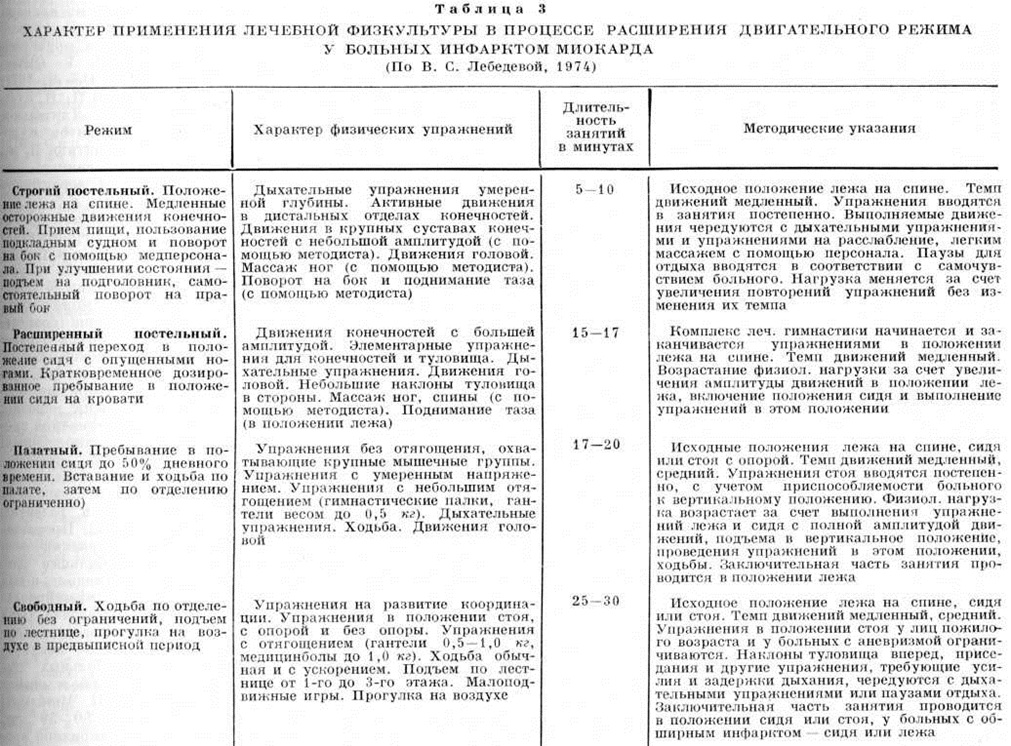 Реабилитация. С первых дней болезни проводятся мероприятия, направленные на предупреждение возможных и лечение возникших осложнений, а также на мобилизацию компенсаторных возможностей организма. Рекомендуется придерживаться следующих сроков пребывания больных Инфаркт миокарда в стационаре: при мелкоочаговом Инфаркт миокарда без существенных осложнений — 20—25 дней, с осложнениями — 25—35 дней; при неосложнённом интрамуральном Инфаркт миокарда — 25—35 дней, с осложнениями — 40—45 дней; при трансмуральном Инфаркт миокарда без существенных осложнений — 40—50 дней, с осложнениями — более 50 дней. Восстановительная терапия включает использование не только медикаментозных препаратов, но и ЛФК, психо и физиотерапевтических, сан.-кур. и других воздействий. Важное значение имеет адватная состоянию физических активность больных Инфаркт миокарда, которая определяется индивидуально для каждого больного. Сроки активизации больных представлены в таблице 2. Диета в первые часы и дни острого Инфаркт миокарда, когда аппетит больного резко снижен, ограничивается фруктовыми соками, минеральной водой, легко усваиваемыми и высококалорийными продуктами. Начиная с 3—4-го дня диету постепенно расширяют за счёт изделий из протёртого мяса, творога и других молочнокислых продуктов, с тем чтобы к 7-му дню заболевания больной был переведён на диету № 10 (смотри полный свод знаний Лечебное питание). Лечебная физическая культура — один из методов в системе восстановительной терапии больных Инфаркт миокарда Она способствует стимуляции вспомогательных, экстракардиальных факторов кровообращения, что способствует облегчению работы сердца, тренировке сократительной функции ослабленной сердечной мышцы, развитию более совершенного приспособления коронарного кровообращения к обменным потребностям миокарда. ЛФК способствует также умеренной активизации дыхания, повышению тонуса нервной системы, улучшению функций желудочно-кишечные тракта, что играет роль и в профилактике гипостатических пневмоний и других возможных нежелательных последствий строгого постельного режима. При проведении ЛФК не должны нарушаться принципы щажения миокарда и обязателен электрокардиографический контроль. Показаниями к началу применения ЛФК являются удовлетворительное состояние больного, отсутствие одышки в покое, прекращение сильных и частых болей в области сердца, снижение повышенной температуры тела, умеренная РОЭ, отсутствие тенденции к снижению артериального давления, отсутствие на ЭКГ данных, указывающих на отрицательную динамику процесса. ЛФК при Инфаркт миокарда — составная часть общего двигательного режима больного; она осуществляется в форме лечебный гимнастики. Расширение двигательного режима и увеличение интенсивности применяемых физических упражнений проводятся строго индивидуально, с учётом возраста, пола больного, обширности инфаркта, динамики заболевания, двигательной активности больного в прошлом. Чем продолжительнее и резче ограничивались движения больного, тем медленнее должно осуществляться расширение двигательного режима. Занятия ЛФК можно начинать при Инфаркт миокарда средней тяжести на 2—3-й день, при более тяжёлых — на 3—7-й и более поздние дни болезни; вначале они проводятся индивидуально в дообеденное время, когда бол