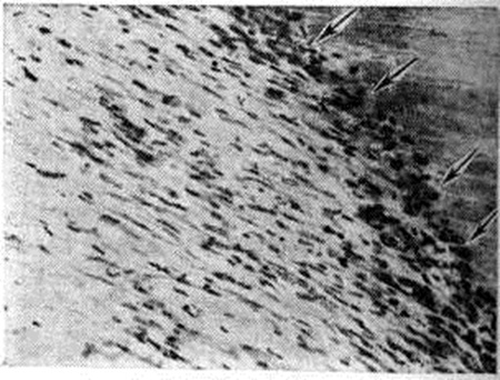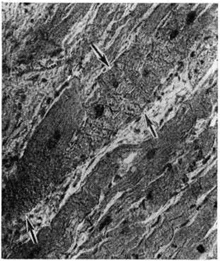 На 3—5-е суток наблюдается постепенное рассасывание некротизированной массы. Резорбция и фагоцитоз осуществляются крупными макрофагальными клетками (рисунок 4), появляющимися обычно на 4-й день по периферии инфаркта, кнаружи от лейкоцитарного вала. В этот же период отмечается распад лейкоцитов в зоне демаркации, пролиферация клеток стромы. На месте распавшихся лейкоцитов остаётся ядерная пыль в виде зёрен ДНК. К 5—6-му дню размеры Инфаркт миокарда стабилизируются (хотя в отдельных случаях прогрессирование некроза может продолжаться до 10—15 суток и более — рисунок 5). Фибробластическая реакция возникает на 4—5-е суток Первые тонкие аргирофильные (рисунок 6) и коллагеновые волокна в зоне инфаркта появляются на 7—8-е суток. В течение 1-й и начале 2-й недель зона некроза представлена лизирующимися мышечными волокнами, лишена сосудов, пропитана отёчной жидкостью с распадающимися по периферии лейкоцитами. Именно эти изменения могут обусловить возникновение острой аневризмы сердца, разрыв сердца, отрыв папиллярной мышцы, разрыв межжелудочковой перегородки. После 7—10 суток процессы репарации протекают в виде замещения некротизированной ткани молодой грануляционной тканью. При небольших инфарктах через 3—6 недель в большинстве случаев зона некроза полностью замещается грануляционной тканью. Полная организация крупных Инфаркт миокарда завершается через 2— 2,5 месяцев. В дальнейшем рубец уплотняется, сосуды в нем редуцируются и трансформируются в артерии, вены и синусоиды. Длительность организации Инфаркт миокарда колеблется в широких пределах в зависимости от его размеров и условий, в которых она происходит. Сроки удлиняются при прогрессировании некроза, при тяжёлом склерозе коронарных артерий, при декомпенсации сердца. В этих случаях пролиферативная реакция замедляется, макрофагальная реакция бывает скудной, и омертвевшие мышечные волокна подвергаются бесклеточному лизису. В результате обнажается стромальный остов сердца и происходит его коллабирование с истончением стенки сердца. Рубец в таких случаях приобретает вид студневидного сероватого очага с желтоватыми точечными некрозами в центре. Реактивные и пролиферативные процессы вокруг такого очага длительное время отсутствуют и лишь спустя 2—3 недель можно заметить размножение клеток стромы (ареактивный и ацеллюлярный Инфаркт миокарда). По краям инфаркта и за его пределами в большинстве случаев обнаруживаются мелкие очаги повреждения и некроза различной давности; часть их возникает в предынфарктный период, другие одновременно с Инфаркт миокарда, а в части случаев они являются морфологический эквивалентом рецидивирующего Инфаркт миокарда