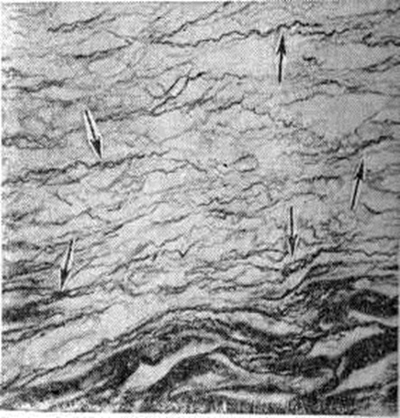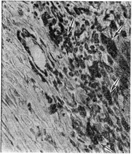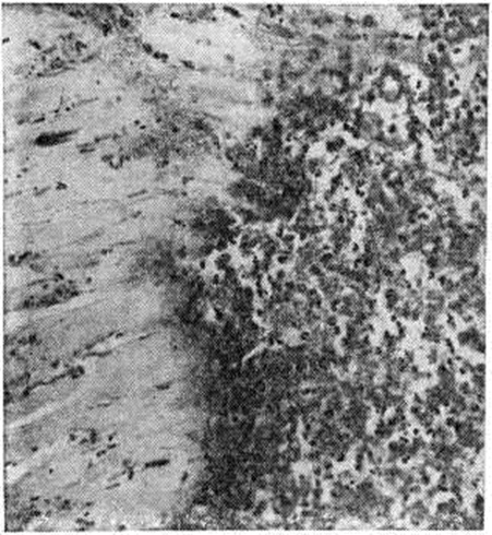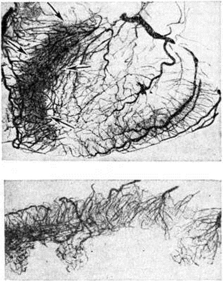 Макроскопически обнаруживаемый в сердце при атипичных Инфаркт миокарда крупный субэндокардиально-интрамуральный, а иногда и трансмуральный некротический очаг по внешнему виду отличается от типичного Инфаркт миокарда пестротой структуры и отсутствием зональности строения. Внешний вид его часто не соответствует длительности клинический. проявлений. В патологоанатомической практике такие очаги обычно расцениваются как организующийся Инфаркт миокарда. Микроскопически такой очаг представляет собой беспорядочно чередующиеся участки фуксинофильной дегенерации и коагуляционного некроза, находящиеся на разных этапах становления и организации, а также участки миолиза, вакуольной, жировой дистрофии, атрофии мышечных волокон (рисунок 7); нередко встречаются и старые рубцовые изменения. В строме очага отмечают расстройства микроциркуляции в виде отёка, полнокровия сосудов, периваскулярных кровоизлияний. Хотя такие Инфаркт миокарда обычно локализуются в зоне кровоснабжения облитерированной или резко стенозированной артерии, ангиографически в них, в отличие от типичного Инфаркт миокарда, отмечается обилие мелких сосудов, образующих густые сплетения (рисунок 8). Иногда в магистральной венечной артерии обнаруживают и свежие тромбы, часто повторные. В этих случаях весь первоначально возникший пёстрый очаг некротизируется и утрачивает морфологический своеобразие. В зависимости от стадии развития Инфаркт миокарда могут выявляться различные его осложнения: разрыв сердца, аневризма, тромбоэмболии, отрыв папиллярной мышцы, перфорация межжелудочковой перегородки, тромбэндокардит и другие. Разрыв миокарда является осложнением раннего периода Инфаркт миокарда, главным образом в первые 3—10 дней (цветной рисунок). Он встречается среди умерших от инфаркта миокарда в 10—15% случаев Решающую роль в возникновении разрыва играют размеры некротического очага — разрыв возникает при обширных трансмуральных инфарктах. Способствуют разрыву артериальная гипертензия и слабое развитие коллатерального кровообращения. При повторных Инфаркт миокарда разрывы наблюдаются реже, чем при первом. Более половины разрывов возникает при инфарктах передней стенки левого желудочка (рисунок 9). Чаще разрыв находится на стыке мёртвого и сохранившегося миокарда в зоне лейкоцитарной реакции и имеет ступенчатый вид. И. В. Давыдовский связывал ступенчатость разрыва с постепенным, а не одномоментным характером разрыва. Редкими осложнениями раннего периода Инфаркт миокарда (1—1,5% летальных исходов) является отрыв некротизированной сосочковой мышцы и перфорация межжелудочковой перегородки. Отрывается обычно одна мышца, причём в 6 раз чаще наблюдается отрыв задней сосочковой мышцы. Разрыв межжелудочковой перегородки, как и разрыв сердца, чаще наблюдается при первом Инфаркт миокарда и при инфаркте, развившемся на фоне артериальной гипертензии. Разрыв межжелудочковой перегородки приводит к развитию острой правожелудочковой сердечной недостаточности. В 20—30% случаев Инфаркт миокарда, преимущественно трансмуральные, осложняются аневризмой сердца (смотри полный свод знаний). Аневризмы чаще локализуются в области передней стенки левого желудочка вблизи верхушки сердца, в задней стенке у основания сердца, реже в области верхушки сердца и в межже