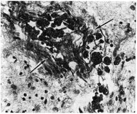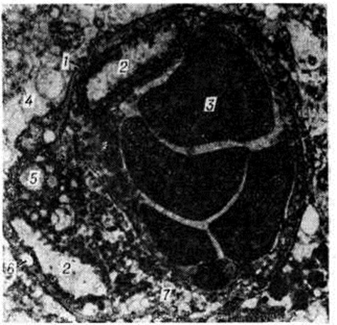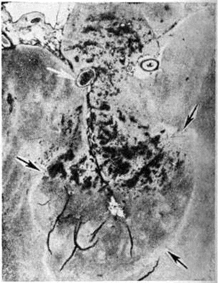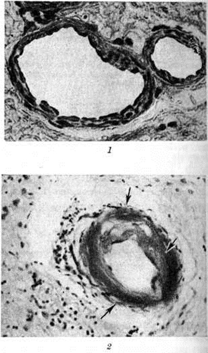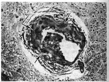 Величина инфаркта мозга зависит от возможностей коллатерального кровообращения, которое включается в момент нарушения кровотока по мозговому сосуду. Наиболее эффективны возможности коллатерального кровообращения при постепенном развитии окклюзирующего процесса во внечерепных сосудах, снабжающих кровью головной мозг; оно осуществляется при этом в основном через артериальный (виллизиев) круг мозга. Поэтому даже полная закупорка внутренней сонной артерии может протекать порой без каких либо клинический, проявлений. Менее благоприятны условия коллатерального кровообращения при разобщении артериального круга и при окклюзии внутричерепных сосудов Включающееся при этом коллатеральное кровообращение по корково-менингеальным анастомозам часто бывает недостаточным. В ряде случаев может возникать относительная недостаточность кровообращения в бассейне сосуда, обеспечивающего коллатеральное кровоснабжение поражённого бассейна (синдром «обкрадывания»). Различают несколько форм синдрома «обкрадывания». При подключичном синдроме «обкрадывания» вследствие закупорки начального отрезка подключичной артерии позвоночная артерия на стороне закупорки функционирует по отношению к руке в качестве коллатерали, по которой в ущерб головному мозгу осуществляется ретроградный ток крови из позвоночных и базилярной артерий в артериальную систему руки. При усиленной работе рукой уменьшается приток крови к мозгу, в результате чего появляются стволовые и другие симптомы. При ишемическом Инсульт реакции артерий в очаге повреждения на сосудорасширяющие и сосудосуживающие влияния отсутствуют либо резко снижены. Поэтому сосудорасширяющие влияния могут приводить к увеличению притока крови только в здоровые области мозга в ущерб кровоснабжению поражённого участка (синдром внутримозгового «обкрадывания»). Напротив, сосудосуживающие влияния, уменьшая порой кровоснабжение здоровых областей мозга, окружающих очаг повреждения, способствуют тем самым перераспределению крови в очаг повреждения (синдром Робина Гуда). Патологическая анатомияТяжесть поражения мозга при Инсульт колеблется от изменений отдельных структурных элементов нервной ткани до образования обширных очагов с грубыми повреждениями мозга. При ишемическом Инсульт развиваются инфаркты (смотри полный свод знаний) — белые, геморрагические, смешанные. При геморрагическом Инсульт различают кровоизлияния типа гематомы и геморрагического пропитывания. Отдельную группу составляют кровоизлияния, возникающие при разрыве врождённых аневризм сосудов мозга. Особую форму представляют также нарушения венозного кровообращения в мозге, протекающие в некоторых случаях инсультообразно. Геморрагический инсульт, как правило, возникает при заболеваниях, протекающих с повышенным артериальное давление. Это обусловлено тем, что сосудистые кризы (смотри полный свод знаний), характерные для гипертонической болезни (смотри полный свод знаний) и артериальной гипертензии (смотри полный свод знаний Гипертензия артериальная), приводят к морфологический изменениям стенок внутримозговых сосудов с нарушением их проницаемости — плазматическому пропитыванию (рисунок 1), некрозам (рисунок 2), образованию микроаневризм (рисунок 3) и их разрывам. Разрыв врождённых артериальных и 