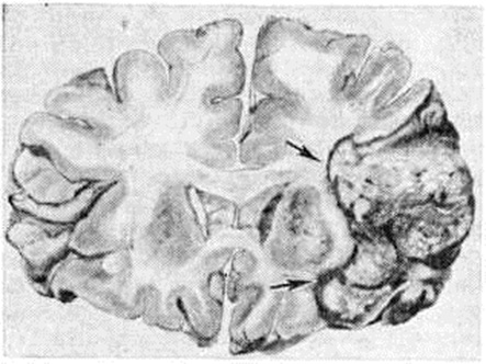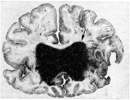 Кровоизлияния типа гематомы сопровождаются образованием полости, содержащей жидкую кровь или свёртки крови; они составляют 85% внутримозговых кровоизлияний, наиболее часто развиваются в подкорковых узлах, реже в мозжечке. Основной механизм развития гематомы — разрыв патологически изменённого сосуда (рисунок 7). Формирование гематомы идёт путём раздвигания кровью вещества мозга с перемещением его участков, что возможно благодаря резервным пространствам (желудочки, подпаутинное пространство). Размеры гематомы при этом превышают объем разрушенного кровью вещества, сдавление окружающих отделов незначительно; лишь при кровоизлиянии в мозжечок сдавление вещества мозга весьма существенно в связи с анатомическими особенностями задней черепной ямки (рисунок 8). Кровоизлияния типа геморрагического пропитывания возникают преимущественно в зрительных буграх, реже в мосту мозга и составляют 15% внутримозговых кровоизлияний. Они являются результатом слияния мелких очагов кровоизлияний, возникающих путём диапедеза из мелких сосудов, имеют вид очагов красного цвета, дряблой консистенции и в силу внешнего сходства иногда напоминают геморрагический инфаркт. В первые часы Инсульт нарушается проницаемость сосудов на границе с кровоизлиянием, развивается отёк; кровь распространяется по ходу нервных волокон. К концу первых суток наблюдаются лейкостазы и лейкодиапедез, размеры очага увеличиваются за счёт диапедезных геморрагий и некробиотических изменений в отёчном веществе мозга. Через двое суток начинается процесс репарации — появление зернистых шаров и гипертрофированных астроцитов; позже образуется вал из астроглии и новообразованных сосудов, кровь подвергается гемолизу, появляются макрофаги с гемосидерином, образуются аргирофильные и коллагеновые волокна. Исходом кровоизлияния может быть формирование глиомезодермального рубца или кисты, содержащих гемосидерин (рисунок 9). В 80—85% кровоизлияний на вскрытии выявляется прорыв крови в желудочки, значительно реже — в подпаутинное пространство. В последнее кровь может также проникнуть из четвёртого желудочка. Первичные вентрикулярные геморрагии нетравматического генеза — явление казуистическое. При разрыве врождённых аневризм артерий основания мозга возникают первичные субарахноидальные кровоизлияния, которые обычно локализуются на базальной поверхности или в латеральной борозде; иногда кровь проникает в субдуральное пространство; часто повреждается вещество мозга (субарахноидально-паренхиматозные кровоизлияния). Расположение гематом, образующихся при этом, зависит от локализации аневризмы, обычно это базальный отдел лобной доли или височная область. В части случаев при незначительном субарахноидально-паренхиматозном кровоизлиянии возможен массивный прорыв крови в желудочки (рисунок 10), что иногда ошибочно диагностируется как первичное вентрикулярное кровоизлияние.