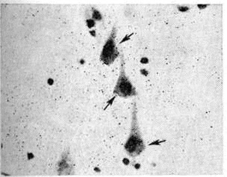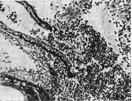 Инфаркты различают по степени геморрагического компонента: белые (серые) инфаркты представлены бледной, дряблой тканью, они составляют 85—90% общего числа инфарктов и могут возникать в любых отделах мозга (рисунок 11 и 12). Геморрагические красные инфаркты имеют вид небольших очагов красного цвета, локализуются только в сером веществе, обычно в коре (рисунок 13), нередко возникают при тромбоэмболиях. Смешанные инфаркты состоят из белых и красных участков, причём последние располагаются преимущественно в лучше васкуляризуемом сером веществе (рисунок 14). При всех видах инфаркта микроскопическое исследование в начальном периоде Инсульт выявляет изменения мозга, обусловленные ишемией: патологию нервных клеток (прежде всего их ишемические изменения — рисунок 15), некробиотические изменения глии. Сосуды более устойчивы к ишемии. Встречаются диапедезные кровоизлияния из мелких сосудов — в очагах серых инфарктов они невелики и единичны, в очагах красных инфарктов и отдельных участках смешанных — они множественные, сливаются между собой. К концу первых суток возникает миграция лейкоцитов, ферменты которых участвуют в расплавлении некротизированной ткани (начало «размягчения»), на 2—3-и суток присоединяется процесс «уборки»; появляются зернистые шары с жиром (рисунок 16), тучные астроциты; организация очага сопровождается пролиферацией волокнистых астроцитов, новообразованием сосудов и коллагеновых волокон и заканчивается образованием глиомезодермального рубца при небольших очагах или соединительнотканных рубцов и многокамерных кист при обширных очагах (рисунок 17). Иногда при стойкой неврологический симптоматике макроскопически не удаётся обнаружить очага полного некроза или рубца; микроскопическое исследование при этом выявляет очаг неполного некроза в коре (гибель нейронов с заместительным астроглиозом). Электронно-микроскопическое исследование коры мозга человека при Инсульт выявляет различные ультраструктурные изменения нейронов, глиальных элементов и капилляров. В ультраструктуре капилляров можно выделить следующие основные патологический изменения: дистрофию стенки капилляра с накоплением в ней лизосомальных включений, липофусциновых гранул, распадом митохондрий, расслоение и вакуолизацию базальной мембраны (рисунок 18). Кроме того, отмечается разрастание и гиперплазия эндотелия. Ультраструктурные повреждения капиллярной стенки сопровождаются разнообразными изменениями из просвета. Обнаруживается ряд изменений основных субмикроскопических компонентов нейронов. Наиболее характерны нейроны, изменённые по гиперхромному типу (рисунок 19), что сочетается с пикнозом ядра, разрушением митохондрий, деструкцией гранулярного и агранулярного ретикулума, наличием большого числа вакуолей и лизосомальных включений, и нейроны с явлениями хроматолиза (рисунок 20), который сопровождается исчезновением цитоплазматических включений, растворением мембранных структур, образованием вместо цистерн ретикулума групп дискретных пузырьков, отсутствием рибосом, набуханием митохондрий, появлением вакуолей. Изменение ультраструктуры капилляров и нейронов сопровождается отёком астроцитарных отростков, скоплением тел глиальных клеток вокруг патологически изменённых элементов. В области расположения патологичес