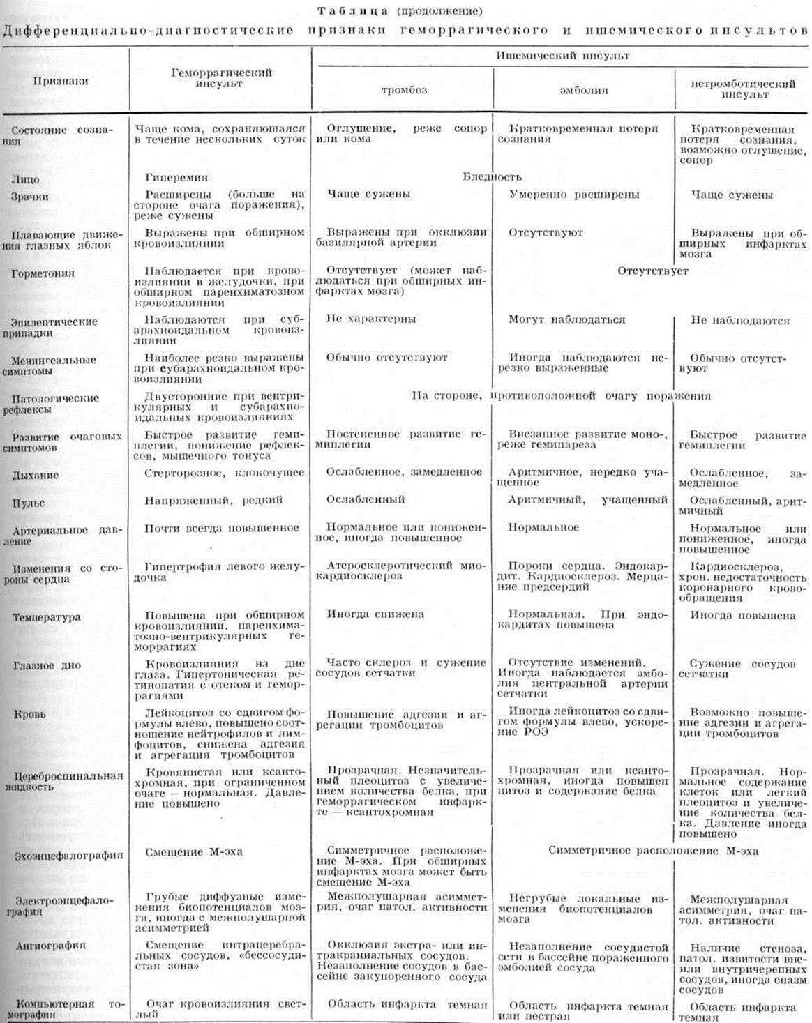 У большинства больных с ишемическим Инсульт наибольшая тяжесть состояния отмечается в первые 2—3 дня. Затем наступает период улучшения общего состояния, который у части больных проявляется некоторой стабилизацией симптомов, у других уменьшением их; при этом темп восстановления нарушенных функций варьирует, он может быть и быстрым и торпидным. Восстановление функций может начаться в первый же день Инсульт или через несколько дней, у некоторых больных лишь через несколько недель. Иногда отмечается тяжёлое течение ишемического Инсульт Летальность наблюдается примерно в 20% случаев. При повторных ишемических Инсульт развивается псевдобульбарный синдром (рисунок 23), прогрессирующие психические расстройства. ДиагнозДиагноз Инсульт ставится на основании: 1) данных анамнеза; 2) клинический, картины; 3) исследования цереброспинальной жидкости; 4) исследования глазного дна; 5) электрокардиографии; 6) реоэнцефалографии; 7) эхоэнцефалографии; 8) электроэнцефалографии; 9) лабораторных исследований крови (система свёртываемости, содержание протромбина, фибриногена, сахара, мочевины и другие); 10) рентгенологическое исследований (краниография, ангиография). Инсульт необходимо дифференцировать с заболеваниями, протекающими апоплектиформно. К их числу относятся: 1) апоплектиформный синдром при инфаркте миокарда (смотри полный свод знаний Кома); 2) апоплектиформное развитие опухоли головного мозга; 3) черепно-мозговая травма в остром периоде (ушиб головы, повреждения кожи и костей черепа); 4) алкогольная интоксикация (дезориентирует запах алкоголя изо рта при Инсульт, развившемся после приёма спиртного); 5) уремия (анурия, вид больного, изменения мочи, азотемия); 6) прогрессивный паралич (смотри полный свод знаний); 7) отравление окисью углерода (смотри полный свод знаний); 8) гипер или гипогликемическая кома (смотри полный свод знаний); 9) геморрагический менингоэнцефалит; 10) эпилепсия (смотри полный свод знаний). Дифференциальная диагностика геморрагического и ишемического Инсульт — смотри полный свод знаний таблицу.