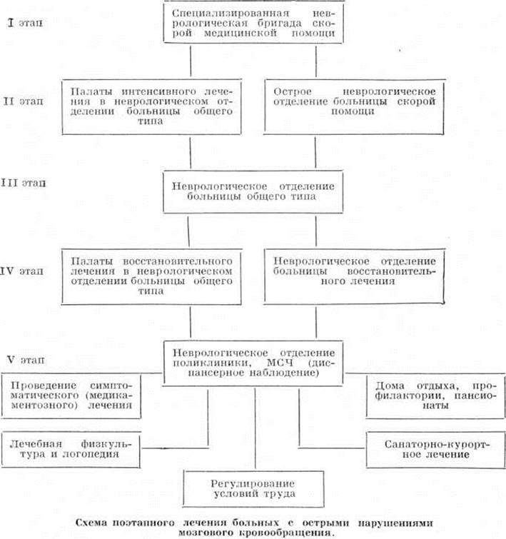 ЛечениеЛечебные мероприятия необходимо проводить безотлагательно, дифференцированно, в зависимости от состояния больного и характера патологический процесса в головном мозге. Ниже приводится схема поэтапного лечения больных с острыми нарушениями мозгового кровообращения. Ранняя госпитализация больных с Инсульт должна производиться в специализированные неврологический отделения или в стационары, где имеются палаты или отделения интенсивной терапии и реанимации. Перевозке в стационар из дома не подлежат больные в глубоком коматозном состоянии с грубым нарушением витальных функций. В тех городах, где созданы специализированные «инсультные» бригады во главе с врачом-невропатологом, оснащённые необходимой диагностической аппаратурой и средствами неотложной терапии, показания к госпитализации расширяются.