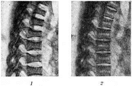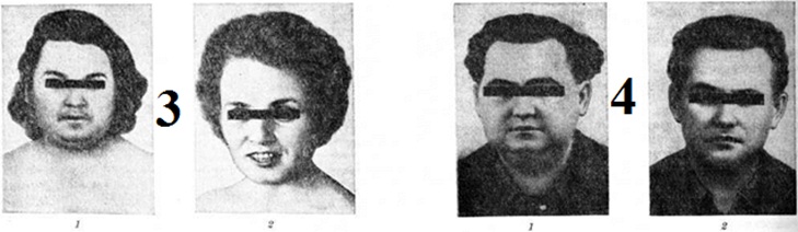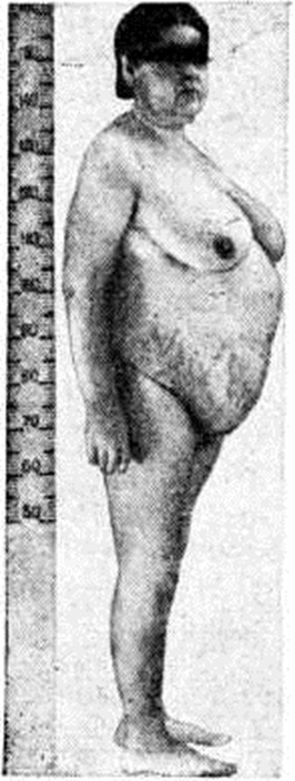 Патологическая анатомия. В аденогипофизе большинства больных обнаруживается гиперплазия базофильных аденоцитов или базофильные аденомы, реже аденомы, исходящие из других видов аденоцитов. Описано поражение ядер промежуточного мозга. В надпочечниках выявляется диффузно-узелковая гиперплазия пучковой и сетчатой зон коры. В сердце — гипертрофия миокарда и признаки развития стероидной кардиопатии, проявляющиеся метаболическими нарушениями. Обнаруживаются также жировая инфильтрация печени, гипоплазия половых желёз, первично-сморщенная почка. Атеросклероз мало выражен, редко развивается инфаркт миокарда. В результате декальцификации костей и выделения большого количества кальция развивается нефрокальциноз (смотри полный свод знаний) и образуются почечные камни, различной степени остеопороз. Клиническая картина. Основные симптомы: неравномерное ожирение, повышение АД, остеопороз, нарушение углеводного обмена, изменение менструального никла (смотри полный свод знаний), иногда выраженный у женщин гирсутизм (смотри полный свод знаний). Заболевание обычно начинается с округления лица, артериальной гипертензии, гипергликемии, в дальнейшем развивается остеопороз, выраженность которого определяет степень тяжести заболевания. Больных беспокоит общая слабость, быстрая утомляемость, сонливость, головная боль, боли в спине и конечностях. Характерен внешний вид больных: лунообразное лицо, диспластическое ожирение с преимущественным отложением жира в области лица, шеи, верхней половины туловища и живота при относительно худых конечностях (рис. 1). Кожа сухая, с меланиновой гиперпигментацией, характерными багрово-синими пятнами, на лице, груди, спине множество угрей, иногда — фурункулов; характерны петехии и экхимозы. Симптоматично появление стрий — полос растяжения кожи на животе, плечах, молочных железах, внутренней поверхности бёдер. Цвет стрий меняется: сине-багровые при обострении заболевания, они становятся затем белесоватыми. У женщин нередко обнаруживается вирильное оволосение преимущественно пушкового характера, волосы на голове выпадают. Постепенно нарушается неврологический и психический статус, обнаруживается нарушение всех видов обмена веществ, в первую очередь белкового и углеводного, угнетается функция половых желёз, нарушается функция почек.