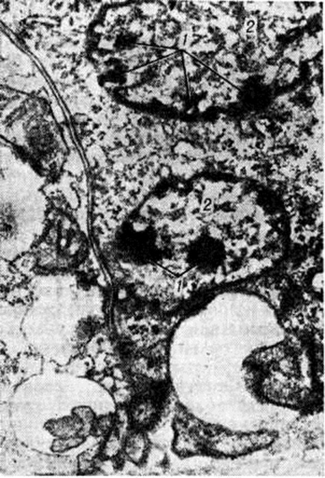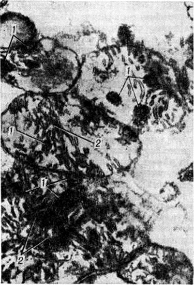 Отложению извести в миокарде и стенке артерий способствует омывание их тканей, относительно бедных углекислотой, артериальной кровью. При известковых метастазах соли кальция инкрустируют клетки паренхимы, волокна и основное вещество соединительной ткани. В миокарде и почках первичные отложения фосфорнокислого кальция находят в митохондриях (рисунок 1 и 2) и фаголизосомах. В стенке артерий и соединительной ткани известь первично выпадает по ходу мембран и волокнистых структур. Большое значение для выпадения извести имеет состояние коллагена и хондроитинсульфатов.
