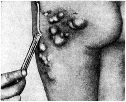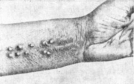 Кальциноз кожи и подкожной жировой клетчатки. В коже чаще других форм встречается метаболический Кальциноз. Ведущую роль в развитии этого вида Кальциноз играют местные нарушения метаболизма в самой коже или подкожной жировой клетчатке. Изменения соединительной ткани, сосудов кожи и подкожной жировой клетчатки обусловливают физ.-хим. сродство ткани к солям кальция. Предполагают, что в результате происходящих при этом ацидотических сдвигов снижается парциальное давление двуокиси углерода и уменьшается растворимость кальция, что способствует его отложению. Метаболический Кальциноз кожи может быть ограниченным и распространённым, или универсальным, с отложением солей не только в коже, но и в мышцах, сухожильных влагалищах. Фосфорнокислый и углекислый кальций выпадает и откладывается в собственно коже и подкожной жировой клетчатке. При этом кожа теряет свою микроскопическую структуру и представляется как бы обсыпанной мелкими зёрнами, интенсивно воспринимающими ядерную окраску; вокруг отложений кальция обнаруживаются гигантские клетки инородных тел. В дальнейшем изменённая кожа становится ломкой. В случаях ограниченного Кальциноз кожи твёрдые узелки возникают преимущественно на верхних конечностях (рисунок 3), в первую очередь в области суставов; реже поражаются нижние конечности, ушные раковины. При универсальной форме различной величины узлы возникают на других участках тела (например, на спине, ягодицах). Покрывающая узлы кожа спаивается с ними, иногда истончается и прорывается (рисунок 4). При этом из вскрывшегося узла выделяется молочно-белая крошковатая или кашицеобразная масса. Это так называемый «кальциевые гуммы» — безболезненные образования, формирующие свищи, отличающиеся вялостью течения и крайне медленным заживлением тяжёлые случаи заболевания характеризуются неподвижностью крупных суставов и атрофией соответствующих групп мышц; процесс сопровождается лихорадкой, кахексией и может привести к смертельному исходу. Ограниченные и распространённые формы Кальциноз кожи и подкожной жировой клетчатки часто наблюдаются при склеродермии (синдром Тибьержа — Вейссенбаха), дерматомиозите (смотри полный свод знаний), атрофирующем акродерматите.