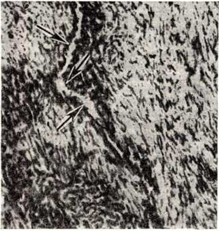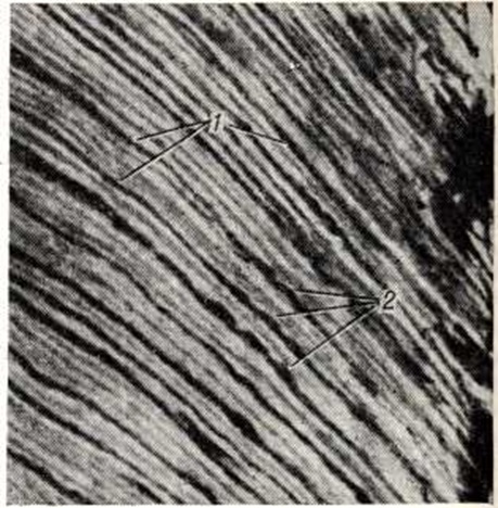 Пигментированное пятно (светло-коричневое) отличается от белого пятна большим размером и глубиной поражения. На шлифах зуба при пигментированном пятне выявляются значительные изменения в подповерхностном слое эмали, в наружном слое деминерализация отсутствует (рисунок 2). Поражение вначале не превышает половины толщины эмали, затем захватывает всю эмаль в глубину. При устранении кариесогенных факторов и стабилизации процесса пятно приобретает темно-коричневый или чёрный цвет. Электронно-микроскопическое исследование кариозного процесса в стадии пятна выявляет ранние изменения в патологический очаге, которые заключаются в потере неорганического вещества по периферии призм, ослаблении межкристаллических связей в эмали, нарушении строгой ориентации кристаллов и изменении их формы и размеров. Гистохимические методами выявлена деградация мукополисахаридов межпризменного органического вещества. В области поражения наблюдается расширение межпризменных пространств (рисунок 3), контуры эмалевых призм обозначаются чётче, резко выражена их поперечная исчерченность, более чётко определяются линии Ретциуса. Нарастание деструктивных изменений ведёт к беспорядочному расположению эмалевых призм, их фрагментации и, в конечном итоге, к превращению эмалевого вещества в бесструктурную, размягчённую массу, насыщенную колониями микробов.