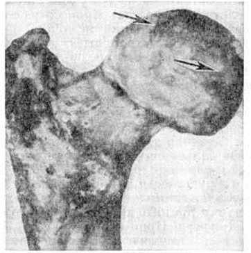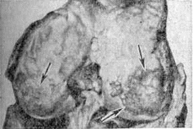 Патологическая анатомия процесса в динамике не изучена. Однако картины его исходов позволяют считать, что в основе болезни лежит механическая неполноценность хрящевого вещества, обусловленная отсутствием в организме субстанции, необходимой для формирования хряща, или, наоборот, поступлением в организм веществ, нарушающих этот процесс. На первый план выступают дистрофические изменения хряща мелких и крупных суставов конечностей, возрастающие соответственно степени болезни. Суставной хрящ мутнеет, истончается, иногда появляются узуры, проникающие в субхондральные отделы кости. Поверхности суставов неровные, шероховатые (рисунок 1). В наиболее нагружаемых участках хрящ стирается, отслаивается, обнажая кость (рисунок 2). Иногда суставная поверхность полностью лишается хрящевого покрытия и представляет собой отшлифованную кость. Суставные концы деформируются. В длинных костях образуются краевые костные разрастания, характерные для деформирующего артроза. В редких случаях наблюдается уплощение головок плечевых и бедренных костей (рисунок 3), которые могут принимать грибовидную форму, разрастание ворсин синовиальной оболочки с образованием рисовых тел. В полостях суставов могут быть свободные хрящевые и костные суставные тела. В грудном отделе позвоночника может развиваться кифоз, сколиоз, в поясничном — лордоз, обусловленный деформациями позвонков. Высота позвонков уменьшена вследствие остеопороза. В дисках появляются трещины, щели с гомогенным или крошковатым детритом. Со временем развиваются явления деформирующего спондилёза с характерными для него краевыми костными разрастаниями. Данных по микроскопическому исследованию костной системы не много, и относятся они лишь к исходам процесса у взрослых. В суставных хрящах обнаруживаются бесклеточные некротические участки, уменьшение базофилии межклеточного вещества, снижение содержания в нем кислых сульфатированных мукополисахаридов, что вызывает демаскирование хондриновых волокон, растрескивание и глыбчатый распад его.