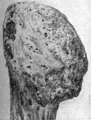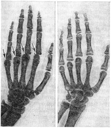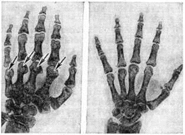 Рентгенологическое исследование позволяет уточнить локализацию и распространённость процесса в скелете, определить характер и степень выраженности изменений, динамически проследить за течением процесса. Для Кашина Бека болезнь характерна множественность и симметричность поражения. Вначале обычно поражаются суставные отделы основных и средних фаланг кистей, затем плюсневые и пястные кости (рисунок 6 и 7), кости лучезапястных, локтевых, голеностопных и коленных суставов; кости тазобедренного и плечевого суставов поражаются редко. Поэтому при массовых рентгенологическое исследованиях в первую очередь необходимо исследовать кисти и стопы. В начальной стадии заболевания патологический изменения локализуются в области ростковых зон костей. Зона предварительного обызвествления метафизов изгибается, утолщается, структура становится рыхлой, негомогенной, а поверхность, обращённая к эпифизу,— неровной и нечёткой. Метафизы бокаловидно расширяются, и в них погружаются эпифизы. Эпифизы деформированы, сплющены, увеличены в поперечнике (рисунок 6) и выступают в стороны в виде плоских чаш. Суставные поверхности костей выпрямлены и в субхондральных отделах склерозированы. Сроки появления ядер окостенения нарушены за счёт ускоренного созревания костной системы. Позвонки поражаются сравнительно редко. Кости мозгового черепа могут поражаться изолированно при нервно-висцеральной форме болезни: характерно наличие множественных лакунарно-кистозных просветлений в спонгиозном веществе (Б. Н. Ерофеев, А. В. Вощенко, 1977). Нередко наблюдается пародонтоз (смотри полный свод знаний) в виде краевых разрежений вдоль альвеолярных отростков челюстей. Суставные и межпозвоночные щели суживаются, но степень выраженности сужения зависит от характера изменений в кости и длительности заболевания. По мере прогрессирования заболевания происходит укорочение и искривление трубчатых костей. Характерно раннее синостозирование эпифизов с метафизами и преждевременное прекращение роста скелета. В дальнейшем развивается деформирующий артроз (смотри полный свод знаний) с образованием внутрисуставных тел и усилением рельефа костей у мест прикрепления связочно-сумочного аппарата.