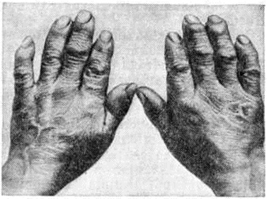 Клиническая картина. Болезнь начинается преимущественно в период роста организма, редко у лиц старше 25-летнего возраста. Процесс развивается, как правило, медленно, постепенно. Быстропрогрессирующие формы наблюдаются редко. Начальный период болезни протекает с непостоянными жалобами на ноющую боль в суставах и мышцах конечностей, в позвоночнике, спине, на скованность, хруст в дистальных суставах конечностей, парестезии, судороги пальцев и икроножных мышц. Деформации суставов и ограничения подвижности не обнаруживается. В развёрнутой клинический, картине заболевания принято выделять три степени тяжести. При I степени Кашина Бека болезнь жалобы становятся более постоянными, развивается умеренное утолщение проксимальных межфаланговых суставов II, III, IV пальцев кистей, движения в лучезапястных, голеностопных и иногда локтевых суставах слегка ограничены; в утренние часы или после физических нагрузки отмечаются боли в поражённых суставах. II степень характеризуется выраженностью и постоянством жалоб. При движениях в суставах выявляется хруст или треск. Объем движений в межфаланговых, лучезапястных, коленных, локтевых суставах значительно ограничен, суставы деформированы, утолщены. У части больных боль и хруст отмечаются также в плечевых, тазобедренных суставах и позвоночнике. Заметна атрофия мышц верхних и нижних конечностей, развиваются мышечные контрактуры. Появляется характерный симптом короткопалости (рисунок 5). Рост больных снижен (у мужчин в среднем 162,2 ± 0,5 сантиметров, у женщин 146,0 ± 0,5 сантиметров). При III степени все суставы конечностей деформированы и утолщены, движения в них резко ограничены. Характерен внешний вид больного: низкий рост (мужчины 160,2 ± 0,6 сантиметров; женщины 144,0 ± 0,5 сантиметров) преимущественно за счёт укорочения костей ног и в меньшей степени позвоночника, короткая шея, резко выраженная короткопалость («медвежья лапа»), genu valgum, genu varum, плоскостопие, компенсаторный лордоз поясничного отдела позвоночника, медленная, переваливающаяся («утиная») походка, у женщин часто узкий таз.