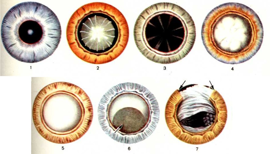 Вторичная Катаракта развивается в результате неполного рассасывания хрусталиковых масс при его механическом повреждении или формируется из остатков не полностью удалённых катарактальных масс или капсулы хрусталика. К образованию вторичной Катаракта может привести организация экссудата, фибрина, элементов крови, пролиферация соединительной ткани. Патологическая анатомия. Старческая Катаракта может быть кортикальной, ядерной и смешанной. Чаще всего наблюдается кортикальная Катаракта. Микроскопическому исследованию чаще подвергаются так называемый зрелые Катаракта (полностью помутневшие хрусталики). При этом отмечается поражение всего коркового слоя. Между корой и ядром хрусталика видны щели, обусловленные склеротическим уплотнением, сморщиванием и отслоением ядра хрусталика от его коры. В щелях обнаруживается белковая жидкость и вакуоли. Хрусталиковые волокна оказываются набухшими, слабо воспринимающими окраску. Наблюдается их распад и превращение в мелкозернистую массу или в крупные капли — морганиевы шары. Изменённые волокна теряют связь с капсулой хрусталика, под ней появляется жидкость и вакуоли. Клетки эпителия передней капсулы хрусталика теряют правильные очертания, набухают, вакуолизируются, их протоплазма слабо воспринимает окраску, а ядра часто уплотняются и интенсивно окрашиваются. Капсула хрусталика при Катаракта изменяется незначительно. Отмечается её утолщение и набухание без заметных структурных изменений. Изменения в хрусталике при травматической Катаракта обычно локализуются в местах повреждения капсулы хрусталика, причём изменениям подвергаются как эпителий, так и корковое вещество хрусталика; капсула нередко оказывается собранной в складки и подтянутой к месту повреждения. Эпителий капсулы образует пролифераты — единичные или множественные разрастания на поверхности хрусталика. Вследствие миграции клеток эпителия кзади образуются его разрастания и под задней капсулой хрусталика. Вещество хрусталика подвергается различным изменениям в зависимости от размеров повреждения капсулы, в нем обнаруживаются многочисленные трещины, заполненные морганиевыми шарами и вакуолями. В изменённом веществе хрусталика может происходить отложение извести или образование кристаллов жирных кислот. Врождённые полярные Катаракта представляют собой остатки эмбриональных образований — зрачковой мембраны, артерии стекловидного тела. При слоистой Катаракта изменения локализуются между корой и ядром хрусталика, где образуются щели с накоплением мелкозернистой массы и вакуолей. Клиническая картина. При первичной Катаракта основная жалоба — на снижение остроты зрения. Расстройство зрения появляется очень рано при помутнениях хрусталика, располагающихся в области зрачка. Если процесс начинается с экваториальной области, острота зрения в течение длительного времени может оставаться нормальной. Иногда первыми симптомами Катаракта являются искажение предметов, монокулярная полиопия (множественное видение предметов). В клинический, течении старческой Катаракта выделяют четыре стадии: начальную, незрелую, зрелую и перезрелую Катаракта (цветной 3—5). В начальной стадии больные могут жалоб не предъявлять, другие же отмечают некоторое снижение зрения, появление «летающих мушек», изредк
