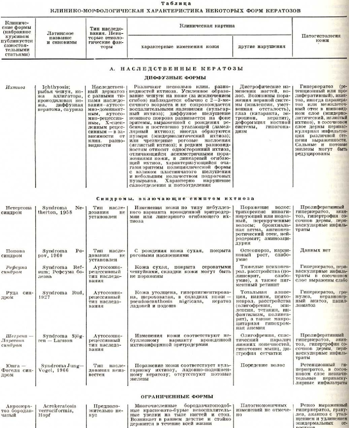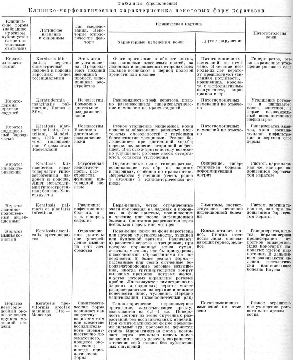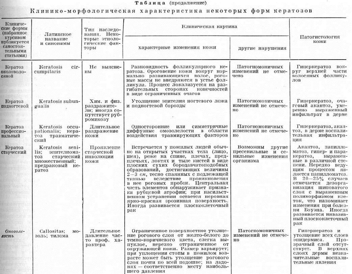 По этиологического признакам Кератозы можно разделить на: 1) наследственные; 2) эссенциальные — приобретённые Кератозы неясной этиологии; 3) симптоматические, являющиеся симптомом другого заболевания или возникающие в результате воздействия экзогенных факторов. Патогистология кератозов характеризуется следующими общими признаками: гиперкератозом, акантозом; в сосочковом слое возможны различной степени выраженности воспалительные инфильтраты, преимущественно вокруг сосудов. Подробнее патология кожи отдельных форм Кератозы дана в таблице. Наследственные кератозы составляют самую многочисленную и разнообразную группу. Наиболее часто встречаются ладонно-подошвенные Кератозы, или кератодермии. Акрокератоз бородавчатый— многочисленные полигональные гиперкератотические бородавчатоподобные невоспалительные узелки красновато-бурого цвета только на тыльной поверхности кистей и стоп (рисунок 1). Дерматоз представляет собой редкую разновидность твёрдого эпидермального бородавчатого невуса; начинается в раннем детстве и не исчезает в течение всей жизни, не вызывая субъективных расстройств; наблюдаются семейные случаи. От бородавчатоподобной эпидермодисплазии (смотри полный свод знаний Эпидермодисплазия верруциформная) отличается отсутствием бородавчатых вегетаций на лице; при дифференциальной диагностике следует иметь в виду также плоские бородавки и Кератозы тыла кистей при болезни Дарье (смотри полный свод знаний Дарье болезнь). Кератоз наследственный ладонно-подошвенный описывается часто под названиями «наследственная кератодермия», «акрокератома наследственная», «ладонно-подошвенный ихтиоз», «симметричный наследственный кератоз». Кератозы характеризуется симметричным поражением ладоней и подошв (в том числе пальцев рук и ног) в виде чётко ограниченных роговых наслоений и усилением узора кожных бороздок. Роговые массы состоят из широких, плотно спаянных, сухих, жёстких, жёлто-восковидных или коричневатых пластинок, достигающих иногда 1 сантиметров в толщину. Поверхность очага поражения вследствие потери эластичности кожи испещрена многочисленными, разной глубины, иногда кровоточащими трещинами. В стадии максимального развития Кератозы роговые массы приобретают черноватую окраску; создаётся значительное затруднение при движении; притупляется чувствительность. В области кератоза — гипергидроз (смотри полный свод знаний). Нередко по краю роговых наслоений видна стойкая эритематозная или сине-багровая кайма шириной 4—5 миллиметров. Очаг поражения может распространиться на тыльную и боковые поверхности кистей и стоп, область коленных суставов, локтевых сгибов и суставных складок. Иногда процесс ограничивается поражением рук и стоп в виде отдельных островков или штриховидных очагов. Кератодермия Папийона — Лефевра (М. М. Раpillon, P. Lefevre, 1924) проявляется на 2—4-м году жизни. Гиперкератоз локализуется на ладонях и подошвах, иногда переходит на тыл кистей и стоп. У больных наблюдаются аномалии прорезывания зубов, гингивит, быстро прогрессирующий пародонтоз с выпадением зубов (смотри полный свод знаний Лефевра—Папийона синдром). Кератоз точечный ладонно-подошвенный — симметричное поражение подошв и ладоней в виде многочисленных диссеминированных или сгруппированных милиарных прозрачных, п