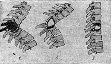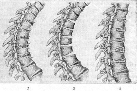 Лечение. Терапевтические мероприятия по поводу Кифоз являются составной частью комплексного лечения основного заболевания, вызвавшего кифотическую деформацию позвоночника. При мобильном Кифоз эффективно консервативное лечение: лечебный физкультура, массаж мышц спины, физиотерапевтические процедуры, плоская постель или гипсовая кроватка с реклинирующим валиком; иногда назначают корсет. Фиксированный Кифоз в ряде случаев удаётся путём вытяжения и корригирующих упражнений перевести в мобильную форму. Однако удержать достигнутую коррекцию без операции практически не удаётся. При свежих Кифоз туберкулёзной этиологии эффективен метод Финка: постоянное давление на верхушку горба ватно-марлевыми прокладками в гипсовой кроватке. Метод применяется преимущественно для лечения детей с начальными формами туберкулёзного спондилита. В лечении Кифоз большое значение имеет лечебный физкультура (рисунок 10). Коррекция Кифоз с помощью специальных упражнений ЛФК показана при многих его формах, за исключением кифотической деформации на почве деструктивных процессов (активный туберкулёзный спондилит, остеомиелит или опухоль). физический упражнения при Кифоз направлены на коррекцию деформации, укрепление мышц спины, выработку ортостатического положения тела и равновесия между физиол. кривизнами позвоночника, улучшение функции дыхательного аппарата, а также общеукрепляющее воздействие. Упражнения выполняют, как правило, лёжа, то есть при разгрузке позвоночника. Показаны следующие виды физических упражнений: 1) разгибания туловища («напряжённые выгибания»); 2) упражнения, мобилизирующие позвоночник в грудном отделе; 3) упражнения, вытягивающие позвоночник; 4) упражнения, расширяющие грудную клетку и растягивающие ретрагированные грудные мышцы; 5) упражнения, вырабатывающие правильную осанку. Мобилизация грудного отдела позвоночника достигается с помощью упражнении, выполняемых в положении на четвереньках; используют упражнения в ползании, а также на месте типа «подлезания». К числу упражнений с вытяжением позвоночника относятся упражнения на гимнастической стенке (так называемый висы). Для выработки правила ной осанки используют упражнения в балансировании с выпрямленным туловищем — стоя на месте и при ходьбе с мячом на голове, а также упражнения — позы, способствующие «самокоррекции» со зрительным контролем перед зеркалом. Лечебный физкультуру при Кифоз сочетают с ручным массажем мышц спины и занятием некоторыми видами спорта. Особенно показано плавание на спине, так как оно способствует коррекции Кифоз, улучшению функции дыхания, укреплению мышц спины. Результат, достигнутый физических упражнениями, закрепляется «лечением положением», то есть кратковременным (15—20 мин.) сохранением больным положения достигнутой коррекции Кифоз. С этой целью используется положение лёжа на груди на клиновидной подставке из дерева или на плотной подушке, либо лёжа на спине с разведёнными в стороны руками на небольшом ватном валике в межлопаточной области. Первые попытки оперативного лечения углообразного Кифоз относятся к концу 19 век и принадлежат Кало (J. F. Calot), который для лечения больных с туберкулёзным спондилитом применил этапную реклинацию (расклинивание) путём рассечения дисков на вершине деформации. Современное опера