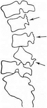 Рахитический Кифоз в прежние времена встречался значительно чаще: он проявляется в младенческом возрасте, когда ребёнок начинает сидеть. В этом случае Кифоз обычно охватывает все отделы позвоночника, бывает дугообразным, нефиксированным, полностью исправляется в положении лёжа. Кифотическая деформация позвоночника типична для туберкулёзного спондилита. Наиболее поражённый процессом позвонок смещается кзади, вышележащий отдел позвоночника наклоняется вперёд, при этом на различных уровнях грудного отдела позвоночника развивается углообразный горб (рисунок 4). При болезни Бехтерева Кифоз имеет дугообразную форму, фиксирован, возникает в возрасте 30—40 лет, значительно чаще у мужчин. Сначала деформация развивается в грудном отделе; в конечной стадии заболевания спина больного образует непрерывную дугу от основания черепа до крестца. При Кифоз, вызванном разрушением позвонка остеомиелитическим процессом (смотри полный свод знаний Остеомиелит), превалируют симптомы острого гнойного воспаления, Кифоз чаще углообразный, в хронической стадии образуются свищи. Для клиники Кифоз, вызванного первичными или метастатическими опухолями позвоночника, характерны боли, Кифоз развивается в поздней стадии — при разрушении и компрессии тела позвонка, часто присоединяются неврологические нарушения. Кифоз при значительной травматической компрессии тела одного позвонка имеет углообразную форму. При переломе нескольких позвонков, даже при незначительной компрессии каждого из них, может образоваться дугообразный Кифоз. Такой Кифоз имеет фиксированный характер. Кифоз может развиться в результате расширенной ламинэктомии с резекцией дужек и суставных отростков позвонков (рисунок 5). В результате ослабленных задних элементов позвонков иногда развивается горб даже в поясничном отделе позвоночника, где в норме имеется лордоз. Старческий, или инволютивный, Кифоз развивается в результате дистрофических изменений межпозвоночных дисков и перестройки костной ткани тел позвонков. Происходит это на фоне выраженного остеопороза позвоночника, причём тела позвонков при незначительных травмах, а в ряде случаев и без них приобретают клиновидную форму, а межпозвоночные диски истончаются. Такой кифоз имеет дугообразную форму. Осложнения наблюдаются при тяжёлых прогрессирующих формах Кифоз Формирование Кифоз приводит к сужению позвоночного канала, особенно на вершине горба, за счёт так называемый клина Урбана, образованного остатками разрушенных тел позвонков. Развивается сначала компрессия корешков, в дальнейшем могут быть парезы и параличи нижних конечностей, нарушение функции тазовых органов. Неврологический спинномозговые и корешковые расстройства редко связаны с механическим сдавлением соответствующих нервных образований при Кифоз Чаще имеет место вторичный перипахименингит и рубцовое сдавление спинного мозга и его сосудов.
