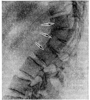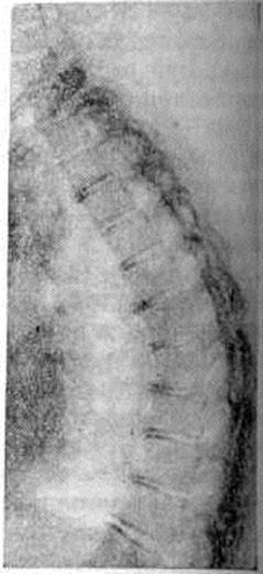 Диагноз. Правильнее говорить не о диагностике Кифоз, а о распознавании болезней или состояний, одним из симптомов которых и является Кифоз Основное значение в диагностике Кифоз наряду с клиническим имеет рентгенологическое исследование. Снимки производят лёжа, в двух проекциях — переднезадней и боковой. Для выявления степени подвижности позвоночника производят снимки стоя и лёжа, а также при наклоне кпереди и кзади. Рентгенодиагностика врождённого Кифоз у детей младше 2 лет затруднена, так как в этом возрасте ещё нет полной оссификации тел позвонков. В более позднем возрасте чётко определяются угловое искривление позвоночника и наличие клиновидного позвонка (рисунок 6). При конкресценции тел позвонков на снимке видно сращение нескольких тел между собой, в основном в передних отделах, и кифотическое искривление позвоночника (рисунок 7). При болезни Шейерманна — May характерно уплотнение поражённых позвонков. В поздних стадиях этого заболевания развивается вторичный деформирующий спондилез (рисунок 8). Старческий Кифоз рентгенологически выражается дугообразным искривлением нижней половины грудного отдела (рисунок 9). Искривление может распространяться на верхнюю половину грудного отдела и на верхние поясничные позвонки. Этот вид Кифоз сочетается с выраженным распространённым остеопорозом (смотри полный свод знаний), а часто и с деформирующим спондилёзом (смотри полный свод знаний). Тела позвонков на боковой рентгенограмме нередко представляются уплощёнными, больше в их передних отделах. Инволютивные изменения при старческом Кифоз происходят и в межпозвоночных дисках, что на рентгенограмме отображается в виде сужения межпозвоночных пространств. При болезни Бехтерева дугообразный кифоз является лишь компонентом богатой рентгенологическое симптоматики этой болезни (смотри полный свод знаний Бехтерева болезнь). Рентгенодиагностика при туберкулёзном кифозе — смотри полный свод знаний Спондилит.