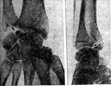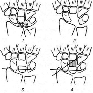 С целью уточнения характера изменений в кости, особенно в начальных стадиях развития патологический процесса, целесообразно применение томографии (смотри полный свод знаний) и рентгенографии с прямым увеличением изображения. Дифференциальный диагноз проводят со стенозирующим лигаментитом (смотри полный свод знаний Тендовагинит), глубоким ганглием (смотри полный свод знаний), с повреждением полулунно-ладьевидной связки, подвывихом полулунной кости, с фиброкистозным дефектом. По клинико-рентгенологическое картине Кинбека болезнь следует дифференцировать с изолированными поражениями полулунной кости туберкулёзного, опухолевого или воспалительного происхождения. При туберкулёзном остите и изолированном ревматоидном поражении полулунная кость деформирована и уменьшена в размерах за счёт деструкции, а не сплющивания и фрагментации, как это имеет место при Кинбека болезнь Воспалительный процесс характеризуется остеолитическими изменениями с разрежением рисунка структуры, тогда как при Кинбека болезнь плотность костной ткани повышена. Лечение длительное время ограничивалось консервативными мероприятиями (иммобилизация, физиотерапия) или удалением полулунной кости. Иммобилизация в циркулярной гипсовой повязке в течение 2— 3 месяцев приемлема только на ранних стадиях при «доброкачественном» течении заболевания; в поздних стадиях иммобилизация лишь уменьшает боль и временно приостанавливает разрушение полулунной кости. Удаление полулунной кости как самостоятельная операция себя не оправдало. Не позднее II —III стадии заболевания рекомендуют операции с укорочением лучевой кости или удлинением локтевой кости; результаты этих вмешательств не всегда надёжны и стойки. То же можно сказать об частичной экскохлеации полулунной кости с пломбировкой полости губчатой костью. Эффективным методом оперативного лечения Кинбека болезнь являются частичные артродезы (смотри полный свод знаний) кистевого сустава: полулунно-лучевые, запястные, лучезапястные и другие. Применяется выполнение частичных артродезов посредством цилиндрической костной пластики по Ашкенази (рисунок 2). При полных разрушениях полулунной кости, когда сохранить её не представляется возможным, производят реконструктивно-восстановительные операции. Немало сторонников находит метод замещения полулунной кости силиконовыми эндопротезами (рисунок 3); однако эндопротезирование (смотри полный свод знаний) не может быть рекомендовано лицам, выполняющим тяжёлую ручную работу. Благоприятные результаты приносят реконструктивные операции с перемещением головки головчатой кости и частичным артродезом запястья (рисунок 4). Иммобилизация после оперативных вмешательств продолжается от в до 12 недель Восстановительное лечение включает лечебный гимнастику, массаж, тёплые ванны. Для профилактики деформирующего артроза у части больных показано сан.-кур. лечение спустя 4—6 месяцев после операции. Прогноз. Течение и исход Кинбека болезнь предсказать трудно. Полное выздоровление даже при рано распознанных поражениях наблюдается редко. Повторные перегрузки или травмы кистевого сустава приводят к прогрессированию деформации полулунной кости, к усилению функциональный расстройств. Если Кинбека болезнь распознана в поздних стадиях у лиц, занимающихся фи