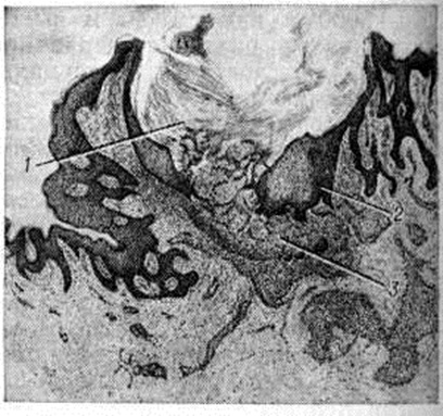 Патогистология. Характерен резко выраженный гиперкератоз с образованием роговых конусов, внедряющихся в эпидермис, как в области волосяных фолликулов, так и вне их. На отдельных участках роговые массы нарушают целость эпидермиса и проникают в собственно кожу, что вызывает образование гранулем, состоящих из лимфоцитов, фибробластов, эпителиоидных клеток и значительного количества гигантских клеток инородных тел; эпидермис по окружности рогового конуса в состоянии акантоза (рисунок 1). В подкожной жировой клетчатке—клеточная инфильтрация, появление кислых мукополисахаридов, уменьшение количества эластических волокон.