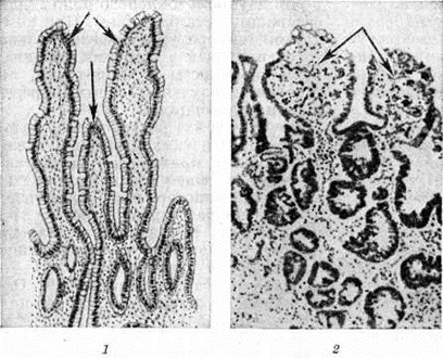 Эпидемиология. При Кокцидиоз, вызываемом I. belli, источником возбудителей инвазии является человек. В окружающей среде ооцисты кокцидий могут сохранять жизнеспособность в течение нескольких месяцев. Факторами передачи возбудителей являются пища, вода, руки и предметы обихода, загрязнённые фекалиями, содержащими ооцисты кокцидий. Источником инвазии при Кокцидиоз, вызванном I. hominis, является крупный рогатый скот. Заражение людей происходит при употреблении плохо проваренного или прожаренного мяса, содержащего цисты кокцидий. Кокцидиоз регистрируется обычно в единичных случаях, однако описаны вспышки в детских яслях, охватившие в течение короткого срока (около 2 месяцев) свыше 30% детей. Патогенез. При проникновении спорозоитов в клетки эпителия кишечника возникает катаральное воспаление слизистой оболочки, приводящее к расстройству функций кишечника и обильным выделениям слизи, иногда с примесью крови. Патологическая анатомия. Сведения о патологоанатомических изменениях при Кокцидиоз у человека чрезвычайно ограничены. Немногочисленные данные биопсий свидетельствуют о наличии воспалительных и атрофических изменений в тонкой кишке. Описаны атрофия ворсинок тонкой кишки, их уплощение, деформация по типу булавовидных образований (рисунок 2), расширение крипт на фоне инфильтрации слизистой оболочки кишки эозинофилами, полинуклеарами, лимфоцитами и плазматическими клетками. На верхушке ворсинок тонкой кишки отмечается очаговое поражение эпителия в виде уплотнения, полиморфизма, отклонений в полярности ядер, в то время как эпителий крипт постоянно выглядит нормальным и не содержит возбудителя. Массивные заражения кокцидиями могут привести к образованию в кишечнике обширных эрозий и иногда язв. Электронно-микроскопически в цитоплазме эпителия ворсинок тонкой кишки обнаруживают все стадии полового и бесполого размножения паразита, вакуоли различной величины, содержащие липиды. Отмечено увеличение количества лизосом, расширение межэпителиальных пространств, куда проникают лимфоциты, эозинофилы, а также липиды. Параллелизма между степенью повреждения эпителия и количеством возбудителя в нем не обнаружено. Существует предположение, что эпителий повреждается вторично вследствие дистрофии собственной мембраны слизистой оболочки. Клиническая картина. Экспериментально установлено, что инкубационный период при Кокцидиоз, вызванном I. belli, длится б—8 дней. При естественном заражении он, повидимому, может быть иным. Заболевание протекает разнообразно, без характерных особенностей. Чаще всего оно выражается симптомами энтерита, реже энтероколита, и сопровождается небольшим повышением температуры. Больные жалуются на общую слабость, головную боль, отсутствие аппетита, тошноту, боли в животе. Стул жидкий с примесью слизи, иногда крови, 4—6 и более раз в сутки. Острые проявления Кокцидиоз связаны с периодом бесполого размножения кокцидий (шизогония) в эпителии тонкой кишки и обычно продолжаются около 2 недель. С наступлением периода спорогонии острые явления затихают и в фекалиях появляются ооцисты, выделение которых может продолжаться от нескольких дней до 1 месяцев и более. При исследовании крови больных Кокцидиоз в ряде случаев определяется гипохромная анемия; со стороны лейкоцитарной формулы крови особых изм