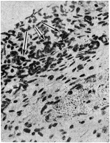 Язвенный коли-энтерит развивается на фоне отёка кишки, язвы располагаются на слизистой оболочке, преимущественно по ходу прикрепления брыжейки (рисунок 2), что объясняется более выраженным отёком стенки в этой области и, следовательно, худшими условиями питания. Язвы округлой или неправильной формы со слегка приподнятыми краями и бледным или полнокровным дном, захватывают только слизистую оболочку, в дне изъязвлений находят обычно слабую воспалительную инфильтрацию на фоне отёка и полнокровия (рисунок 3). При длительном существовании язвенного процесса в дне и краях изъязвлений развивается склероз. При коли-энтеритах, особенно язвенных, нередко наблюдается пневматоз слизистой оболочки, подслизистого и мышечных слоёв кишки, а иногда и лимфатических, узлов, что, по-видимому, связано с газообразующими свойствами Е. coli. Атрофический коли-энтерит наблюдается при длительном и рецидивирующем течении болезни. При этом тонкая кишка резко истончена. Гистологически все слои стенки кишки атрофичны, слизистая оболочка в области бывших язв замещена грануляционной тканью (рисунок 4), в подслизистой основе — скудный инфильтрат из лимфогистиоцитарных элементов. При гистологический исследовании наблюдаются изменения миокарда в виде очаговой фуксинофильной дистрофии (рисунок 5), микронекрозов (рисунок 6), а при длительном течении болезни — очаги кардиосклероза. Эти изменения миокарда у детей объясняются нарушением водносолевого обмена и значительным дефицитом калия вследствие поносов и рвоты. Осложнённые формы кишечной Коли–инфекция (стафилококк, синегнойная палочка, кандидоз и другие) характеризуются наличием некрозов, углублением язвенных дефектов слизистой оболочки. Патологоанатомически исключить присоединение к Коли–инфекция грибкового или стафилококкового энтероколита можно путём окраски срезов по Граму или Мак-Манусу. Клиническая картина. Инкубационный период продолжается чаще 4—5 дней. Заболевание начинается остро, реже постепенно: повышается температура, нарушается общее состояние, появляются понос и рвота. Стул частый (от 5 до 10—15 раз в сутки), испражнения жидкие, иногда водянистые и часто имеют золотисто-жёлтую, оранжевую или зелёную окраску; изредка наблюдается небольшая примесь слизи. Рвота редкая, но обычно упорная, повторяющаяся в течение многих дней. Часто наблюдается метеоризм. В тяжёлых случаях отмечается первичный нейротоксикоз; в результате нарастающей интоксикации, частых дефекаций и упорной рвоты происходит значительная потеря воды и солей, развивается эксикоз различного типа (смотри полный свод знаний Токсический синдром). Преобладает соледефицитная дегидратация. Часто возникает ацидоз (смотри полный свод знаний). В начале болезни может наблюдаться кратковременная гиперкалиемия, а затем происходит быстрая, прогрессирующая потеря калия с мочой и калом (смотри полный свод знаний Гипокалиемия). Температура даже при среднетяжёлой форме остаётся повышенной в течение 4—5 дней. Характерно волнообразное течение и периодические обострения, которые частично могут быть обусловлены присоединением острой респираторной инфекции. Иногда болезнь принимает затяжное течение и продолжается до 2—6 месяцев. Наблюдаются также лёгкие и стёртые формы. Течение болезни, её тяжесть в основном определяются возр
