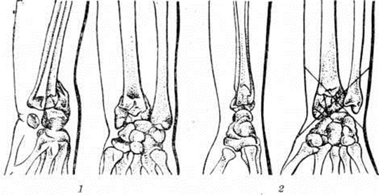 При раздробленных переломах дистального эпифиза лучевой кости происходит компрессия губчатого вещества эпифиза и после репозиции между отломками может возникать диастаз. В гипсовой повязке по мере спадения отёка вследствие этого наступает вторичное смещение, предупредить которое можно чрескожной трансартикулярной фиксацией отломков двумя крестообразно проведёнными спицами через обе кости предплечья (рисунок 2). Иммобилизация в течение 6—7 недель.