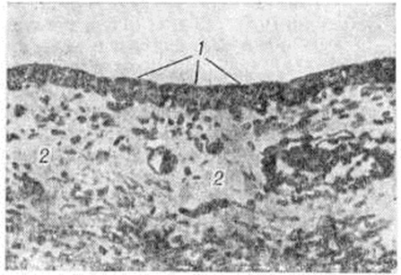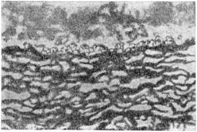 Субэпителиальный слой Конъюнктива образован в общем из тех же двух основных элементов, что и истинная лимфоидная ткань,— из сетевидной стромы (ретикулум), плазматических клеток и лимфоцитов, иногда образующих небольшие скопления — фолликулы. Глубокий слой представлен рыхлой волокнистой соединительной тканью, относительно бедной сосудами и клеточными элементами. В нормальной Конъюнктива взрослого отмечается обилие малодифференцированных клеток и разнообразных по виду гистиоцитарных элементов. В субэпителиальном слое имеется сеть аргирофильных волокон, в петлях которых скапливаются клетки. Эластические тонкие волоконца представлены в небольшом количестве (рисунок 1). В первые 2—3 месяцев внеутробного развития человека соединительнотканная основа Конъюнктива век (её собственная пластинка) состоит из рыхлой соединительной ткани и тонких коллагеновых волокон (рисунок 2). В ней, в отличие от Конъюнктива взрослых, обнаруживается значительно меньшее количество клеточных элементов и большая нежность и рыхлость расположения волокон соединительнотканной основы.