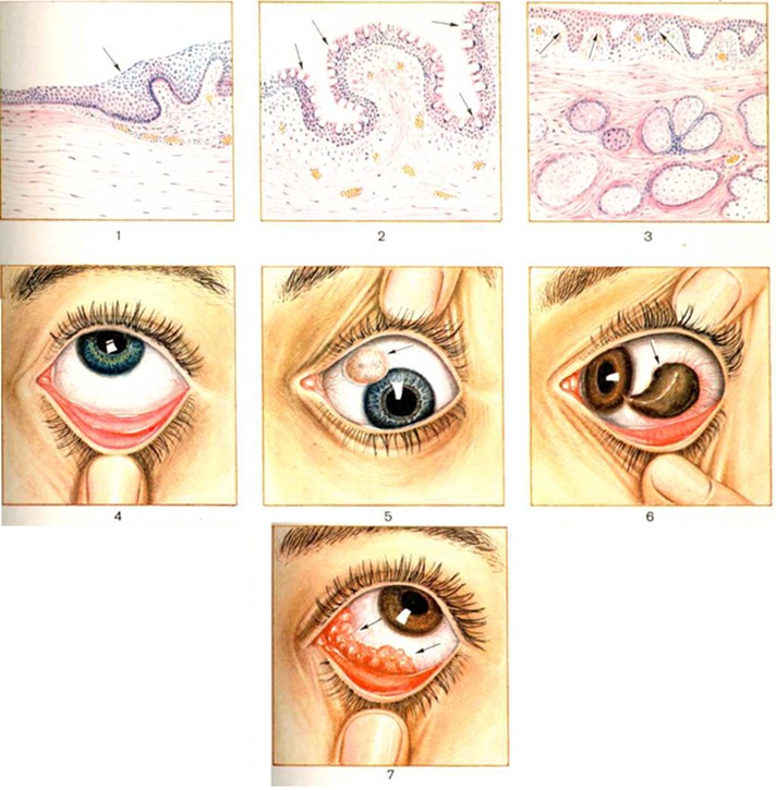 Состав клеток собственной пластинки Конъюнктива новорожденных также значительно отличается от Конъюнктива взрослых. Лимфоциты по сравнению с другими клетками встречаются редко, главным образом в поверхностном слое, вблизи кровеносных сосудов. Плазматические клетки совсем отсутствуют. Основную массу клеток собственной пластинки Конъюнктива новорожденных составляют фибробласты и камбиальные элементы. Изменения, наблюдаемые в Конъюнктива у лиц пожилого возраста, характеризуются уменьшением количества и изменением состава клеточных элементов, а также усилением процесса коллагенизации, что ведёт к уменьшению количества аргирофильных волокон. Вместе с относительным обеднением субэпителиального слоя клеточными элементами уменьшается количество малодифференцированных форм и лимфоцитов. Основными элементами инфильтрации подэпителиального слоя становятся плазматические клетки, у которых часто наблюдаются признаки дистрофии. Коллагеновые пучки становятся более толстыми, грубыми, часто подвергаются гиалинозу. Субэпителиальная ткань у пожилых людей теряет аденоидную структуру (рисунок 3). Железы Конъюнктива (железы Краузе), расположенные в верхней и нижней переходной складке, по строению и характеру секрета аналогичны слёзной железе. Их насчитывают от 20 до 30 на верхнем веке и только 6—8 на нижнем. Большей частью они круглой или овальной формы и находятся в субэпителиальном слое. Каждая железа состоит из ряда долек и имеет общий выводной проток. Такие же железы (железы Вальдейера) имеются на границе тарзальной и орбитальной части Конъюнктива. В височной части верхнего свода Конъюнктива открываются выводные протоки слёзной железы. Конъюнктива обильно снабжена сосудами. В её васкуляризации участвуют задние конъюнктивальные сосуды, исходящие из системы артериальных дуг верхнего и нижнего века, и передние конъюнктивальные сосуды, относящиеся к системе передних ресничных артерий. Задние конъюнктивальные сосуды питают Конъюнктива хряща, переходной складки и глазного яблока, за исключением пери лимба ль- ной зоны, которая снабжается передними конъюнктивальными сосудами. Передние и задние конъюнктивальные артерии связаны анастомозами. Вены Конъюнктива сопутствуют артериям, но их разветвления более многочисленны. Часть из них впадает в вены лица, а другие — в систему вен глазницы. Лимф, сосуды Конъюнктива век образуют густую сеть, лежащую в подконъюнктивальной ткани. Направление этих сосудов совпадает с ходом кровеносных сосудов — от височной половины Конъюнктива лимфатических, сосуды идут к предушному узлу, а от носовой — к подчелюстным лимфатических, узлам. Чувствительные нервы Конъюнктива получает от первой ветви тройничного нерва — глазного нерва (n. ophthalmicus). Его ветвь — слёзный нерв (n. lacrimalis) — иннервирует височную часть Конъюнктива верхнего и отчасти нижнего века; надглазничный нерв (n. supraorbitalis) и надблоковый нерв (n. supratrochlearis) снабжают носовую часть Конъюнктива верхнего века. От второй ветви тройничного нерва — верхнечелюстного нерва (n. maxillaris) отходят скуловой нерв (n. zygomaticus), который снабжает височную половину Конъюнктива нижнего века, и подглазничный нерв (n. infraorbitalis), снабжающий её носовую половину. ФизиологияОбилие чувствительной иннервации в Конъюнктива обеспечивает выполнение защитной функции 